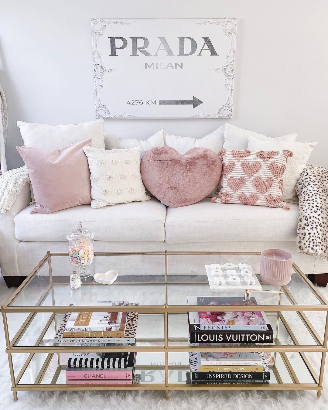 Achieve a plush, inviting look with soft pastel pillows and a gold-framed glass coffee table. Stack fashion-themed books as a nod to modern elegance, topped with a candy jar for a sweet touch. A textured heart-shaped pillow adds a dash of whimsy to the ensemble, perfect for a cosy and fashionable living space.