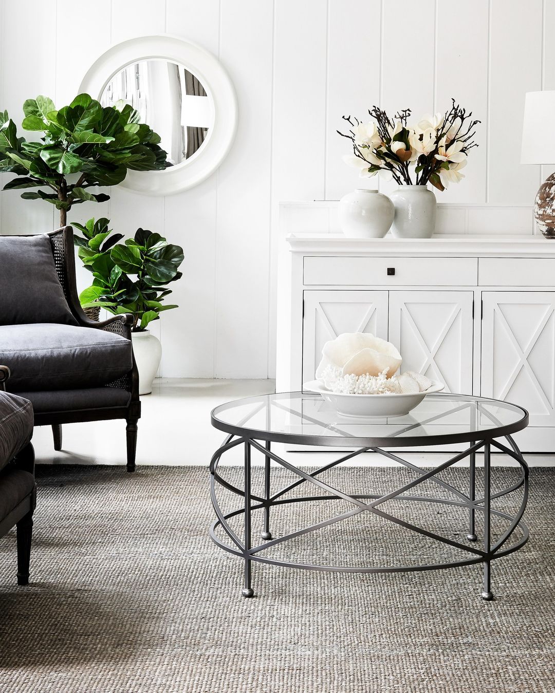 This living area showcases a circular glass coffee table with a sleek black frame, enhancing the contemporary vibe. The table’s clean lines are softened by the textured vase and plush throw, creating a harmonious balance. A muted color palette and abundant natural light lend a tranquil, chic atmosphere to the space.