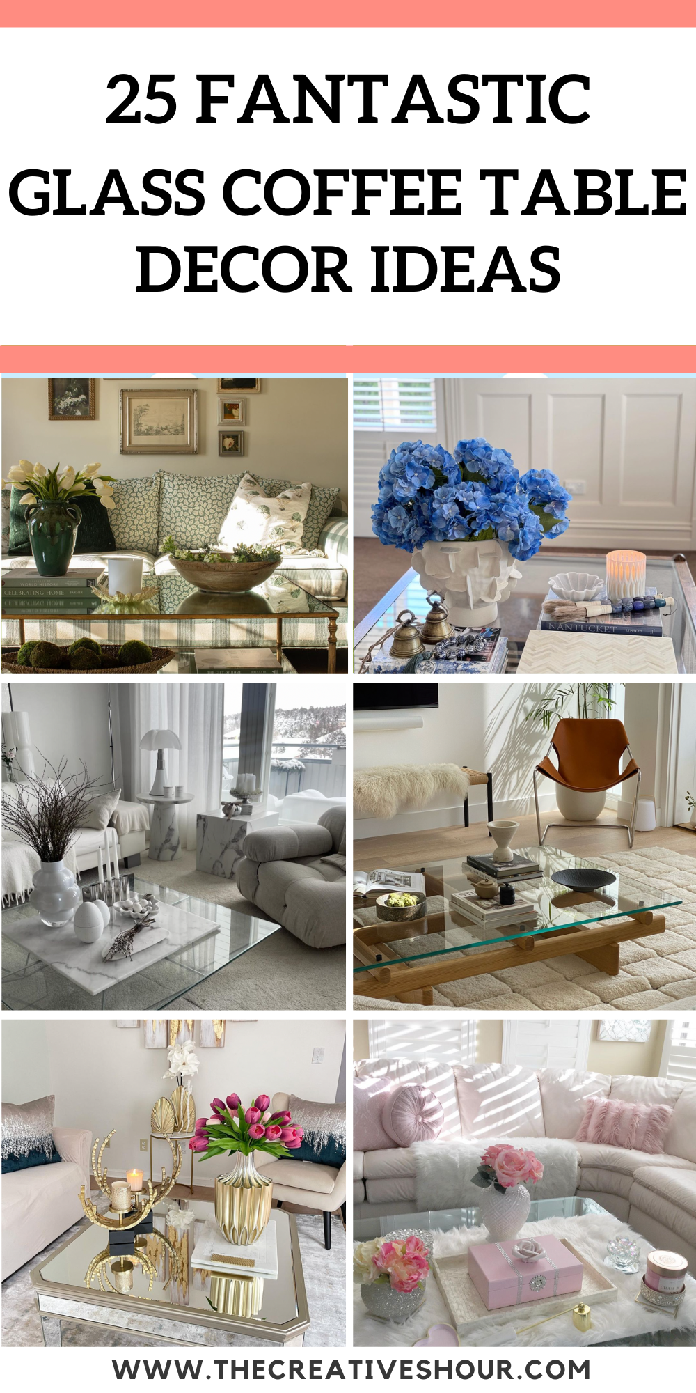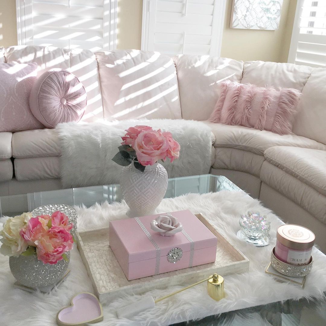 Adorn your glass coffee table with touches of blush pink for a soft, romantic vibe. Gracefully place a pink round decorative pillow on the couch to complement the table’s decor. Enhance the elegance with a silver crystal vase and candle holder, reflecting light and adding sparkle. Anchor the setting with a chic pink box for a hint of luxury amidst fresh blooms.