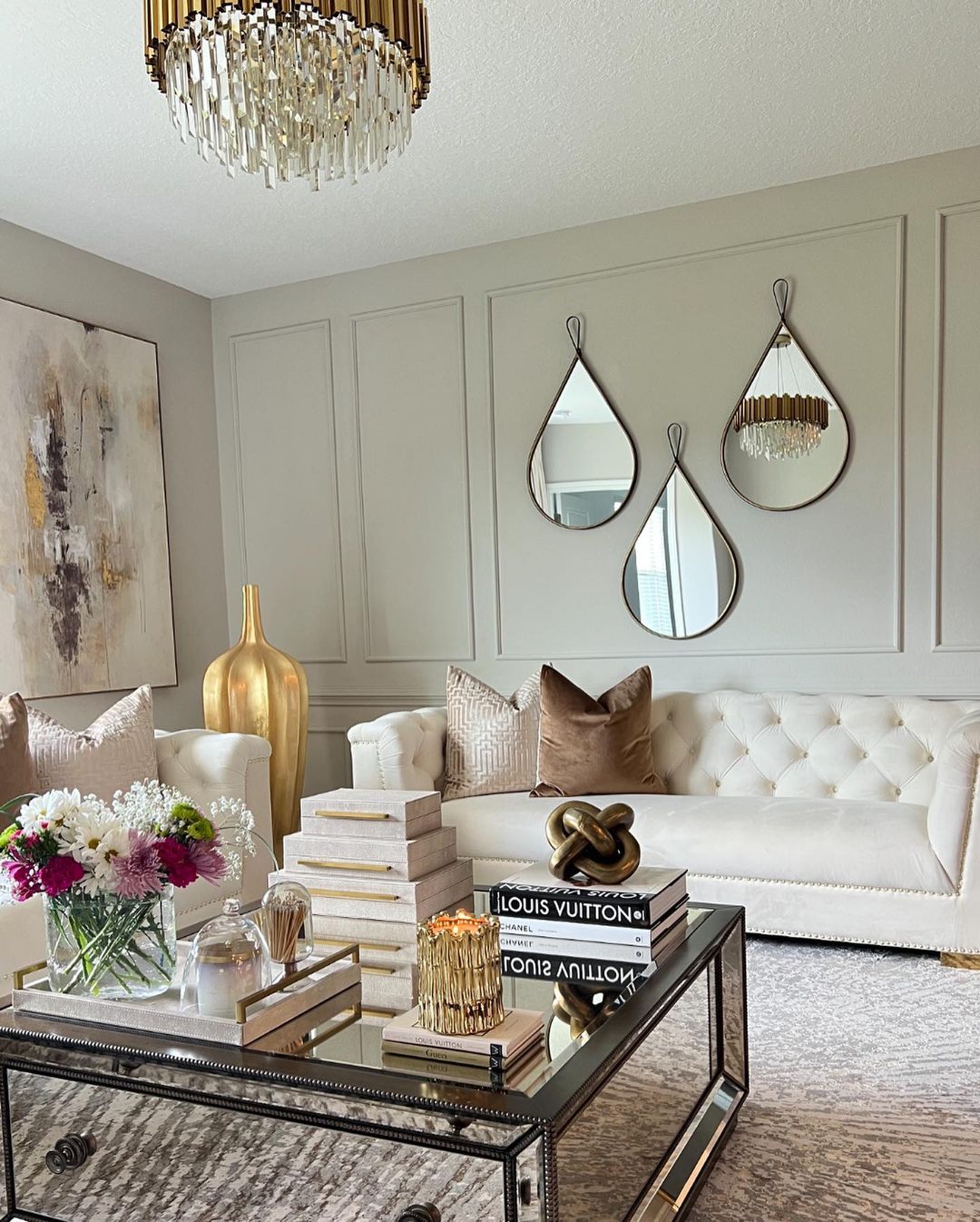 Create a layered, textured look with a mirrored glass coffee table as your anchor. Stack books in varying shades of white for a monochromatic effect. Add fresh flowers for a pop of color and a sculptural golden piece for an artistic touch. This setting offers a luxurious and inviting ambiance perfect for modern chic decor.wet