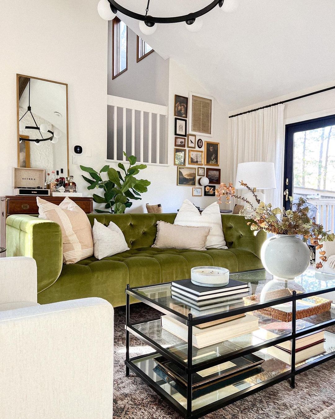 Nestle a black-framed glass coffee table amid a vibrant mix of eclectic textures and colors. A curated stack of books reflects the owner’s literary taste, while a vase with branches adds a touch of organic charm. The lively backdrop of assorted wall art and a plush green sofa infuse the room with personality and warmth.