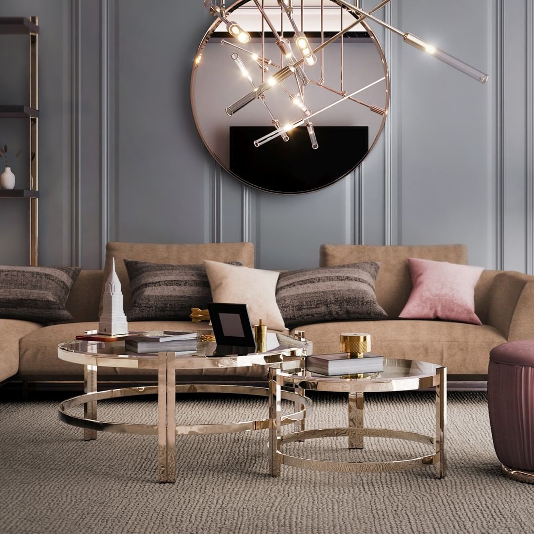 Position a set of round glass coffee tables for a dynamic, layered effect in a contemporary living space. The metallic frames add a luxurious edge, complementing the muted tones of the surrounding furniture. Strategic placement of books and chic decor items creates a cultivated and refined atmosphere, balancing modern design with inviting comfort.