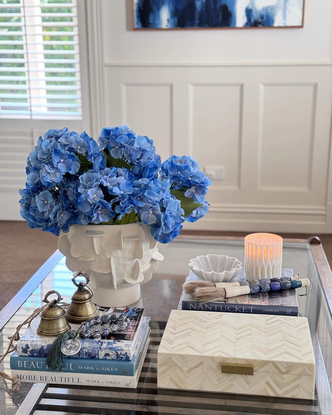 Create a seaside escape with a burst of classic blue hydrangeas on your glass table. Accentuate with nautical-themed books and vintage bells for a timeless look. Use a patterned box and artistically placed paintbrushes to add a creative flair. Finish with a softly lit candle, for a serene and inviting atmosphere.