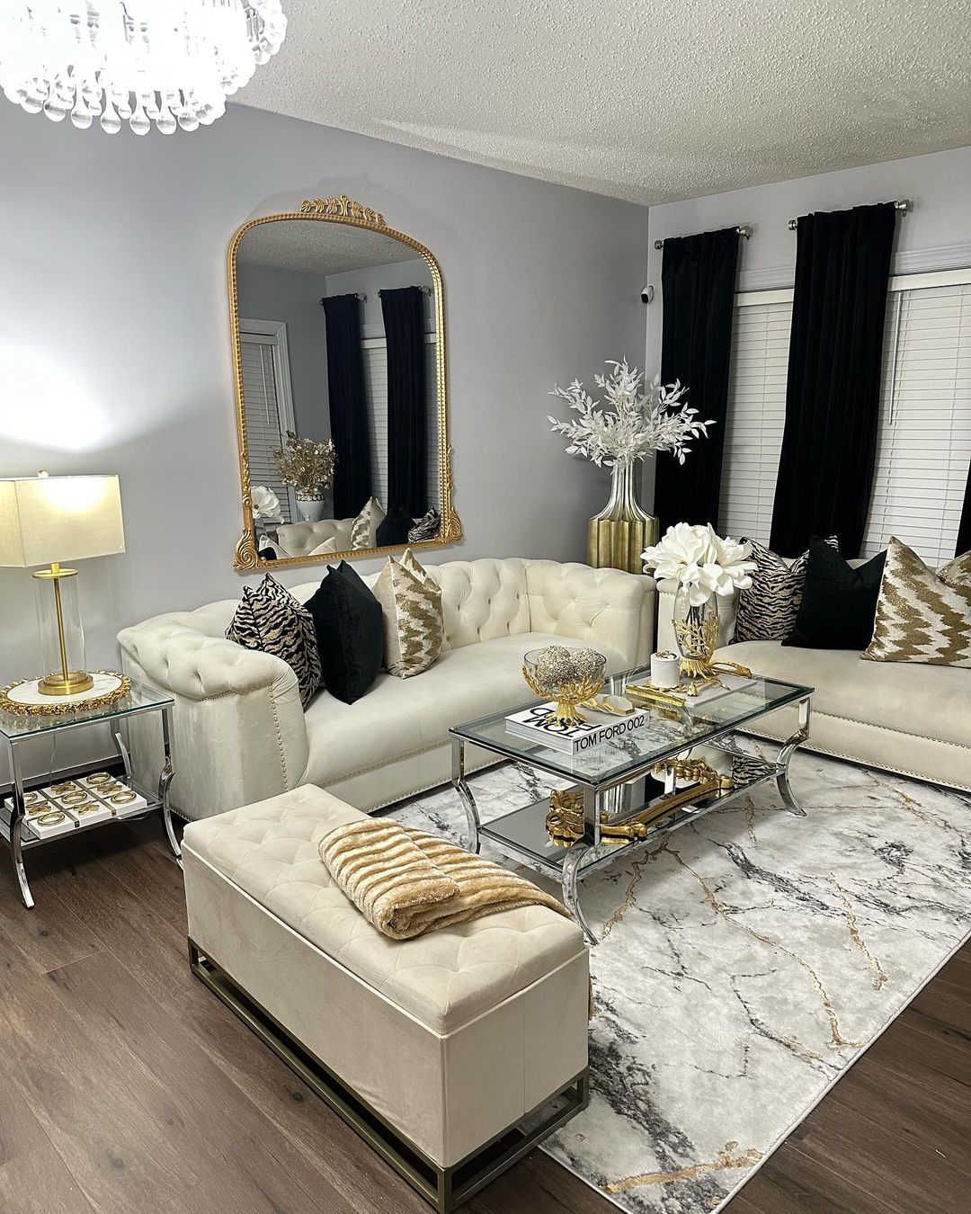 Design a monochrome theme using a mirrored glass coffee table for a luxurious feel. Place a statement fashion book and golden decorative pieces for a touch of opulence. Add contrast with a variety of textured pillows on the sofa. White florals in a silver vase tie the elegant decor together, enhancing the room’s chic sophistication.