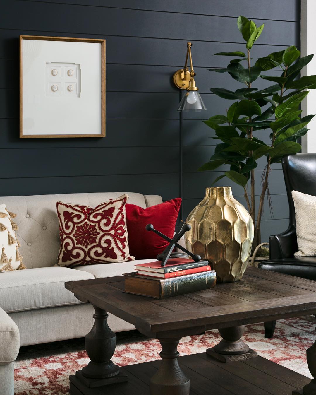Grey shiplap sets a moody stage here, but it’s the styling that steals the scene. Jewel-toned velvet pillows pop against the deep wall, pulling in warmth without dimming the drama. Brass accents and a sculptural gold vase add just enough glam to keep things elevated. Tip: when your wall’s this bold, let your textures do the talking.