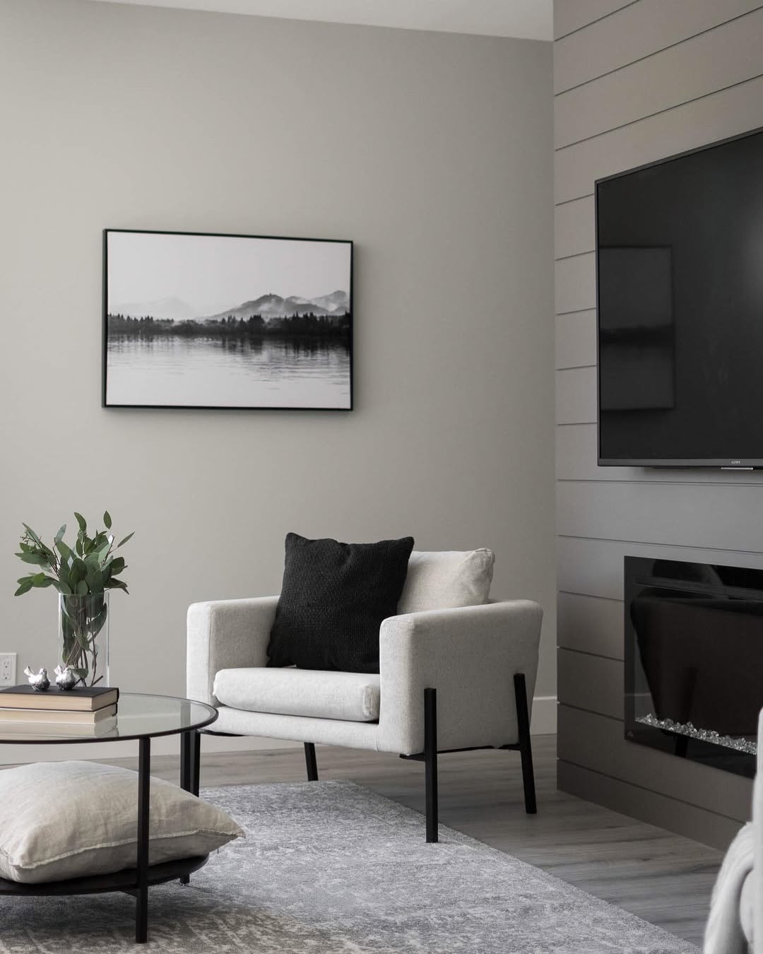 A linear shiplap treatment around the fireplace adds subtle texture without stealing focus. In this tone-on-tone setup, it’s all about clean lines and quiet contrast—the perfect backdrop for modern furnishings and monochrome art. Matte finishes keep things soft, not sterile. It’s minimalism, warmed up just enough.