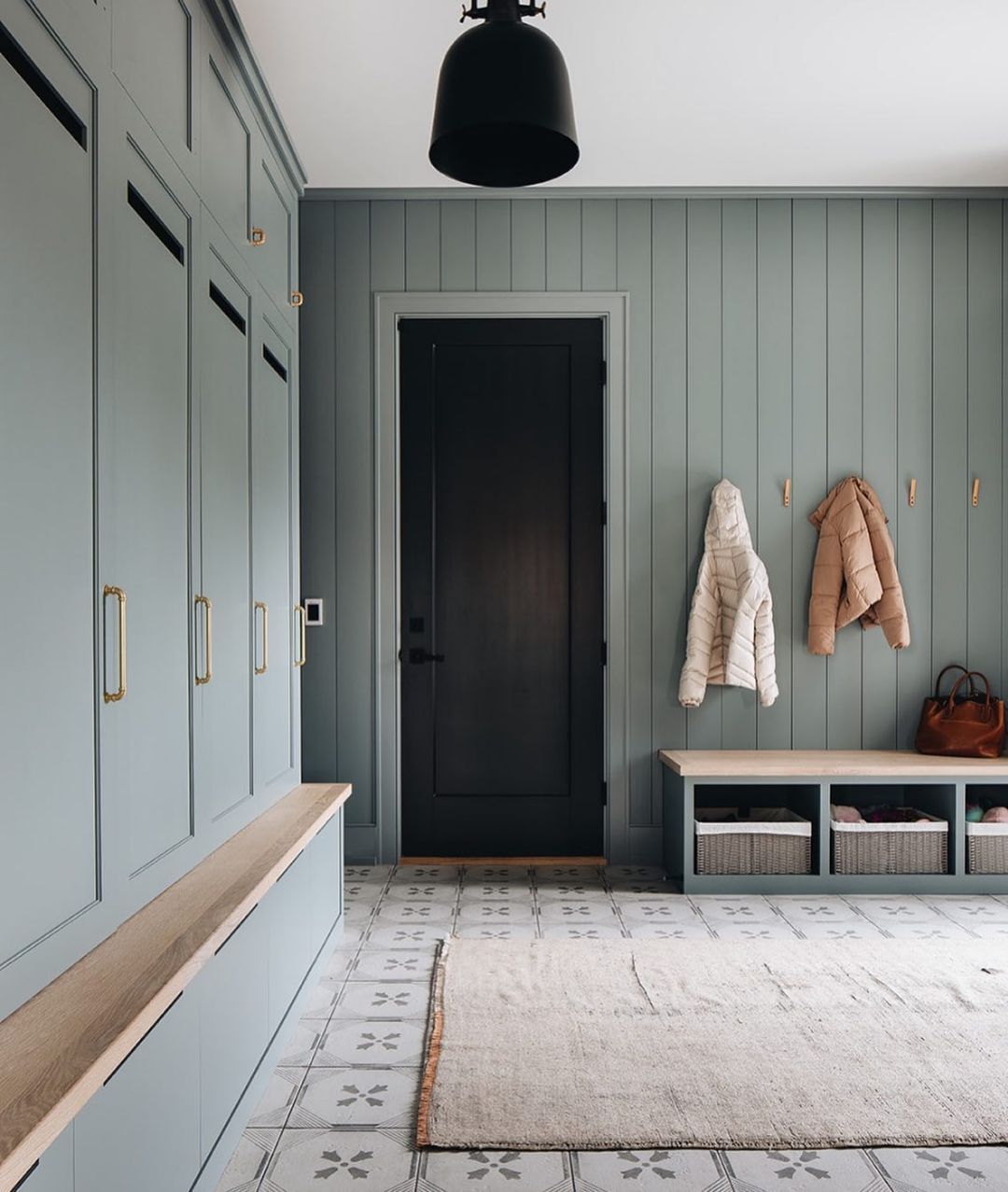Vertical paneling in a dusty sage brings a tailored calm to this hardworking mudroom. The matching built-ins and bench keep the palette cohesive, while the matte black door adds just enough contrast to ground the space. Gold hardware and patterned tile sneak in a little polish. It’s utility, dressed like a boutique hotel.