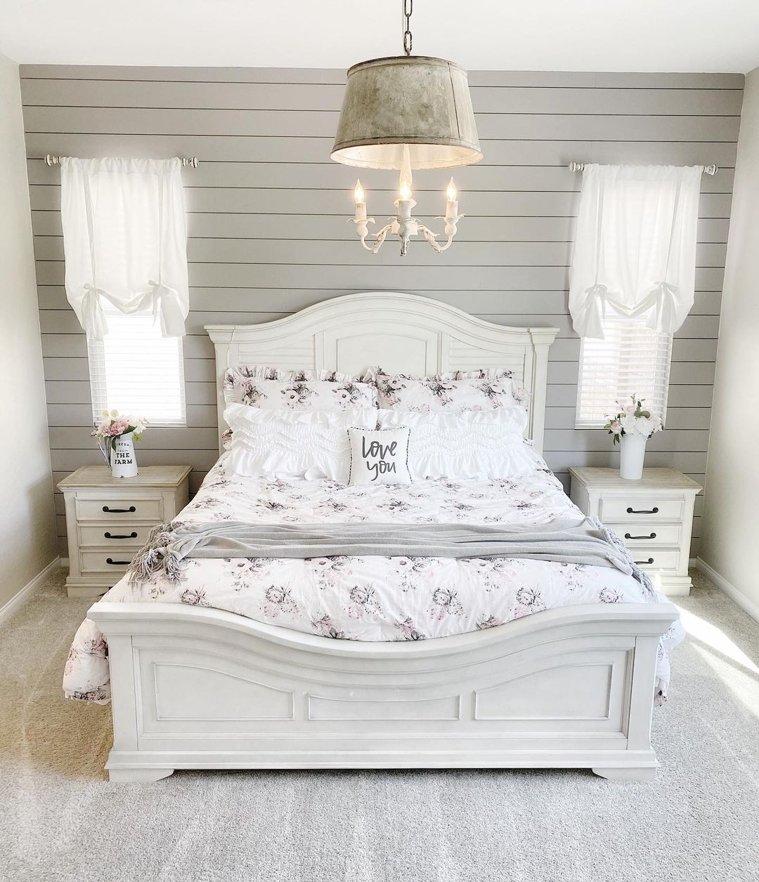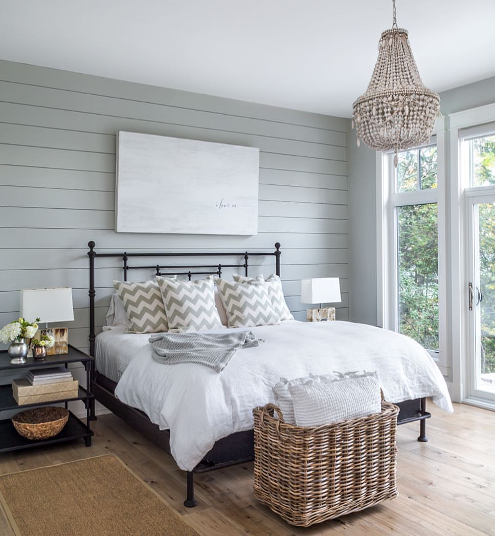 Pale grey shiplap sets a breezy tone in this sun-drenched bedroom. The soft hue plays nicely with natural light, letting bold zigzag pillows and black metal accents take center stage. A woven chandelier adds just enough texture to keep things beachy, not basic. It’s modern cottage vibes, minus the seashells.