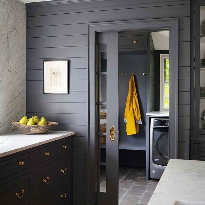 Matte charcoal shiplap gives this pantry-meets-laundry zone a surprisingly elegant edge. Paired with marble counters and brass hardware, it feels more like a tucked-away cocktail bar than utility space. That bold mustard jacket? A style moment in disguise. Proof that moody walls belong beyond the living room.