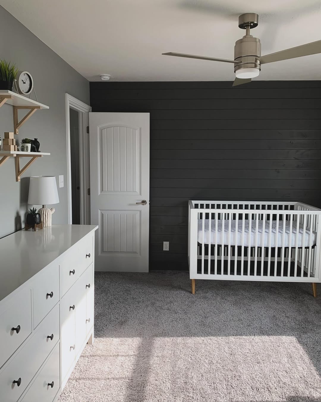 A deep charcoal shiplap wall gives this baby’s room a bold, grown-up edge—proof that nurseries don’t have to be pastel palaces. The crisp white crib and dresser pop against the moody backdrop, keeping the palette clean and graphic. Minimal decor and a sleek ceiling fan dial up the modern vibe. It’s baby’s first lesson in good design.