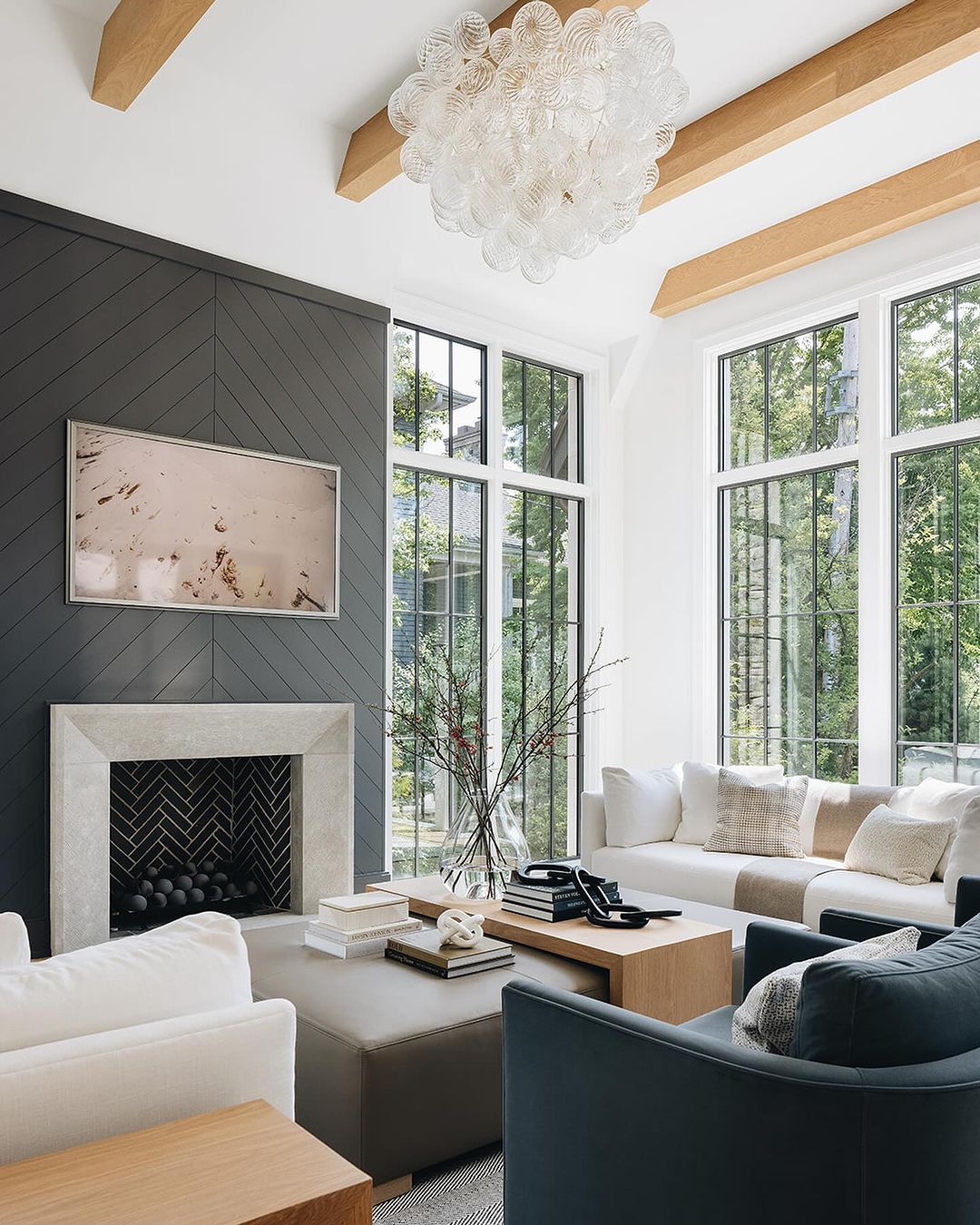 Grey shiplap goes modern with a sharp chevron twist—proof that farmhouse textures can play in sleek spaces too. The tone-on-tone look keeps things cohesive, while the angled lines add just enough edge. Anchoring it all? That matte black herringbone firebox pulling double pattern duty. Skip the whitewash—this is shiplap with a grown-up agenda.