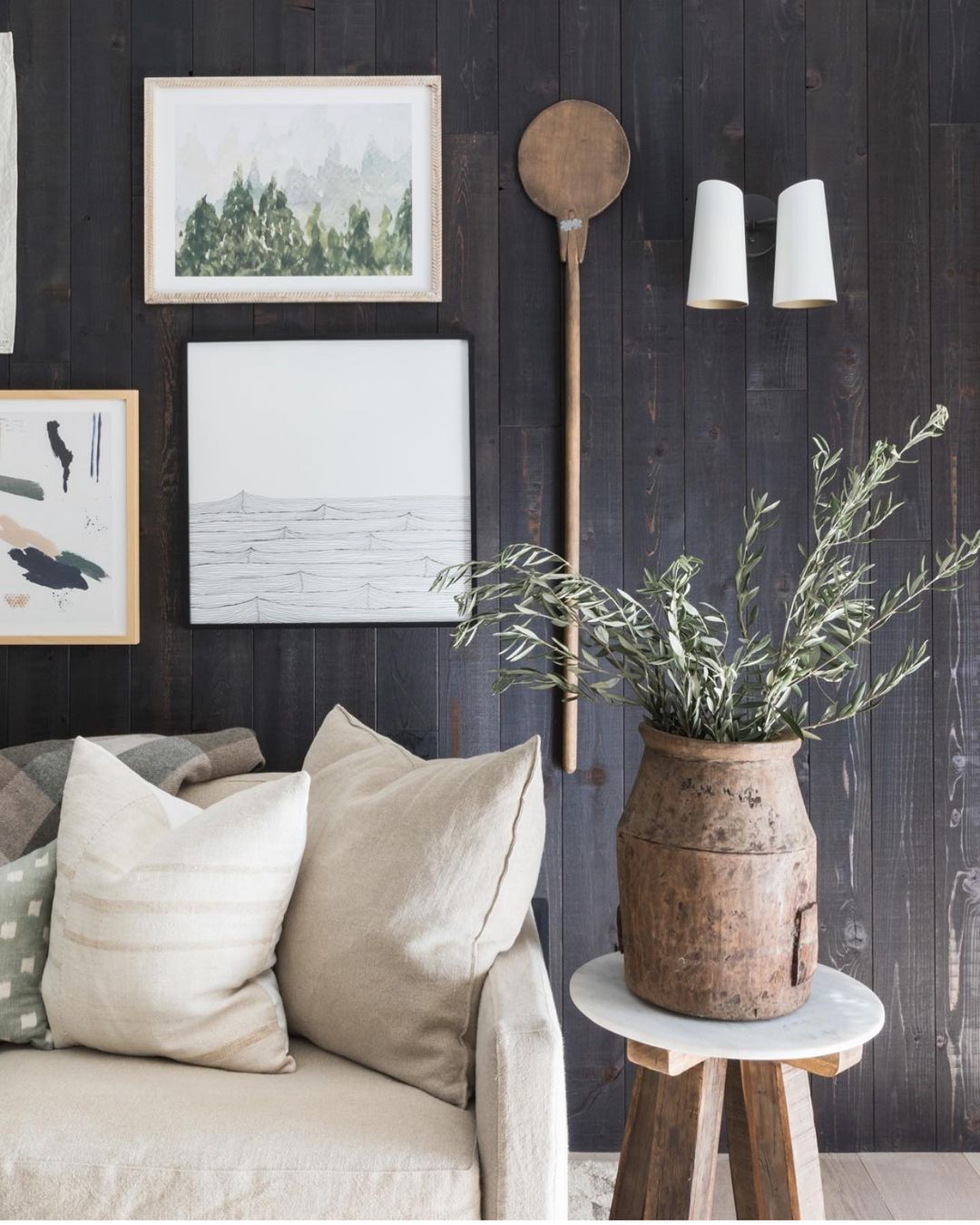 Charred wood shiplap brings rustic drama, setting a moody tone that’s more artful than outdoorsy. The wall’s inky texture makes every frame pop, especially the nature-themed prints that echo the palette without blending in. Earthy accents like the worn milk jug and olive branches keep it grounded. Feels like a modern lodge that reads Kinfolk on weekends.