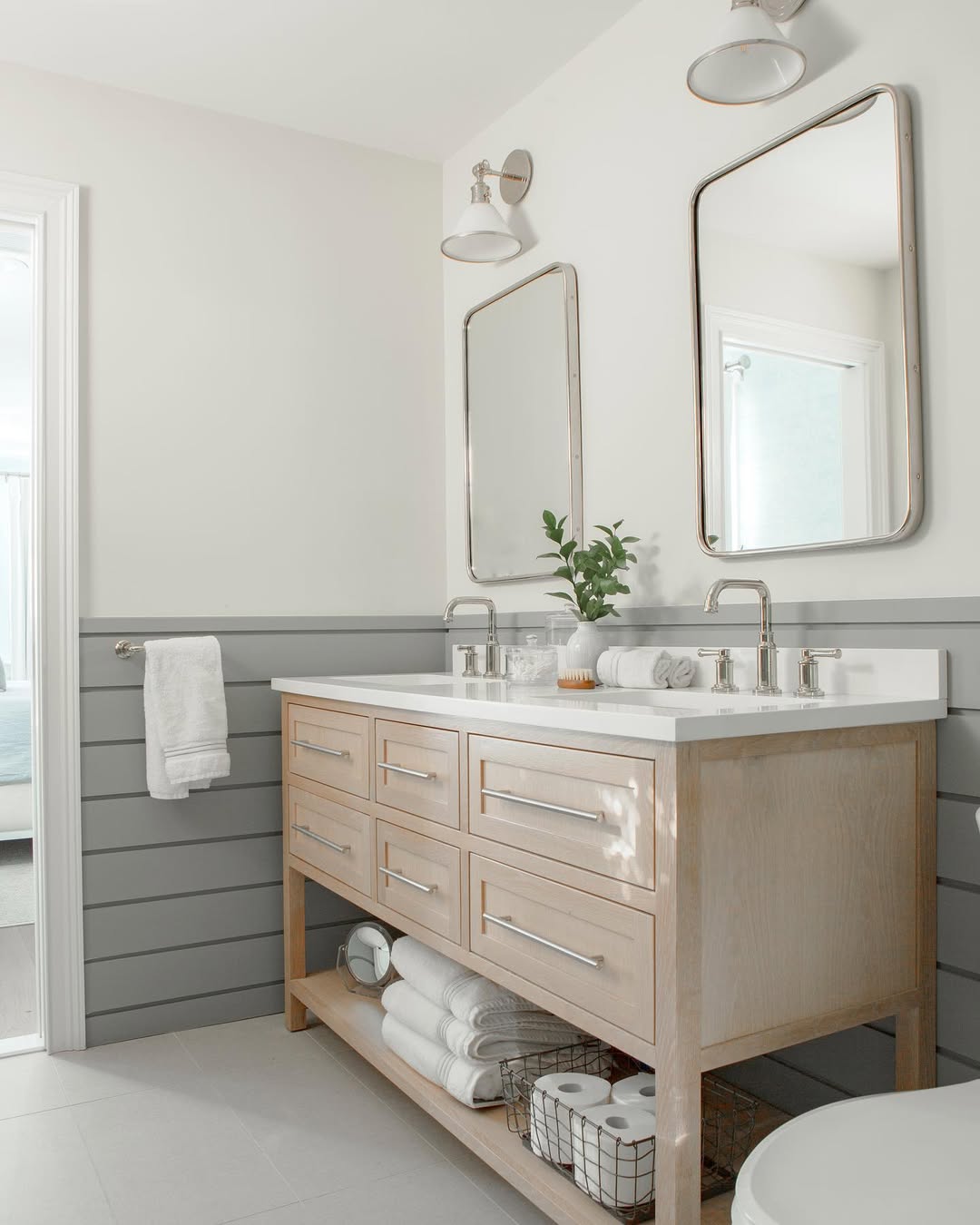 This two-tone bathroom nails balance with soft grey shiplap wrapping just the lower half. It breaks up the white walls without crowding the space, giving the room subtle texture and polish. Pale wood cabinetry adds warmth, while chrome accents keep it crisp. Classic, calm, and quietly clever.
