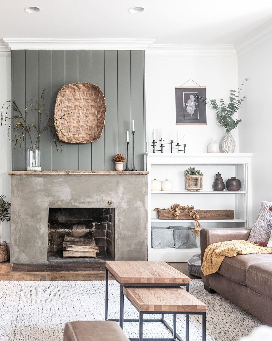 Olive-toned vertical shiplap adds calm contrast behind the rough concrete fireplace, softening the industrial edge with a touch of polish. The simple basket-as-art moment keeps things casual, while layered neutrals and natural wood tones pull the room together. It’s a mix of grit and grace—without trying too hard.