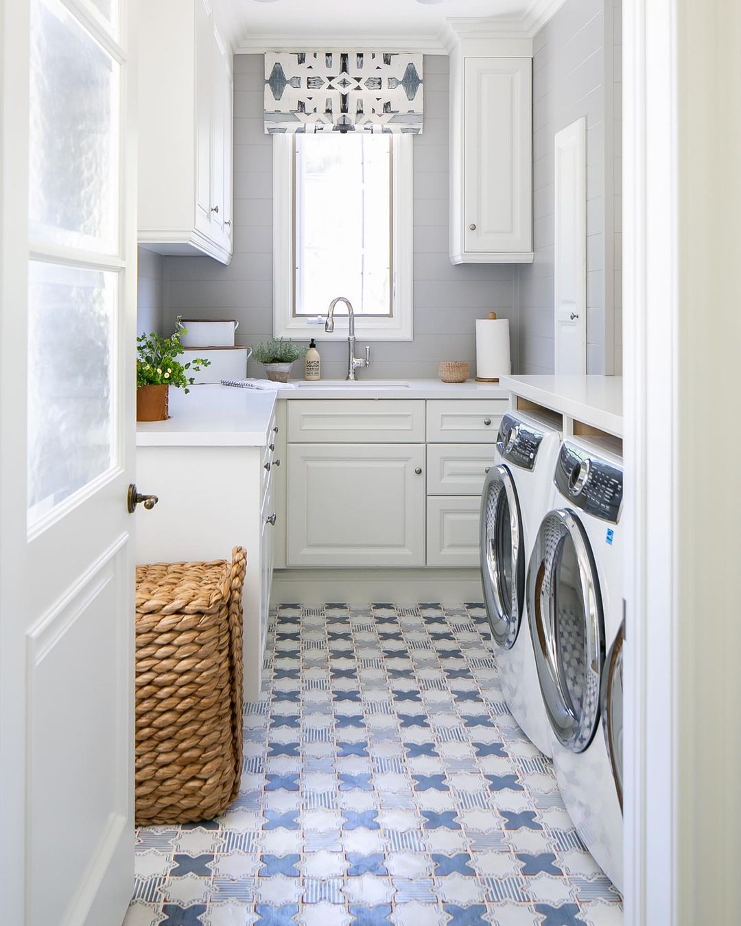 Soft grey shiplap walls keep this utility space feeling bright but not bland. Paired with classic white cabinetry and patterned tile underfoot, the room reads crisp and collected. A bold Roman shade adds a hit of personality without overpowering the calm. It’s laundry day, leveled up.