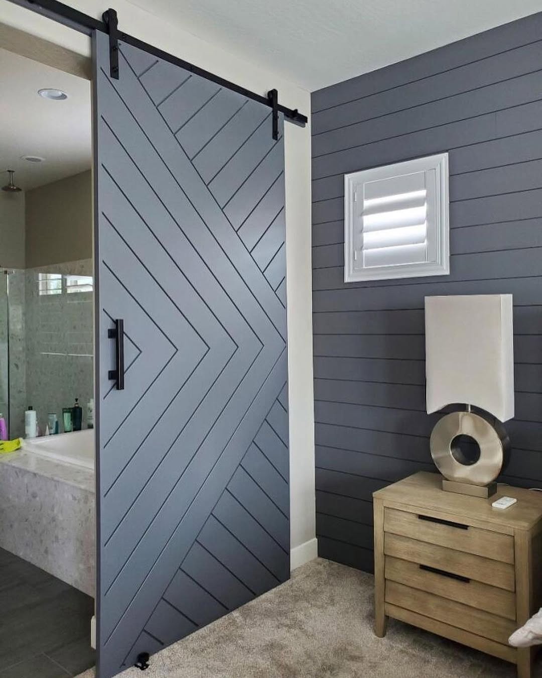 This sliding barn door doesn’t just separate rooms—it shows off. The chevron pattern adds movement and bold geometry, breaking up the horizontal shiplap on the adjacent wall without clashing. Matte black hardware gives it that modern edge, while the muted blue-grey hue keeps it calm. A functional piece turned full-on focal point.