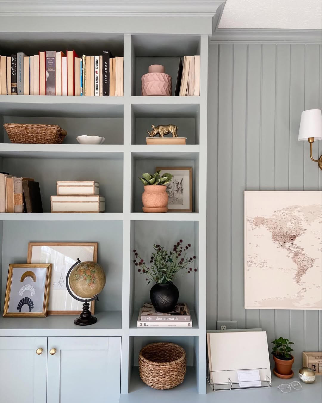 Built-ins and beadboard get a fresh update in this soft sage hue, adding instant calm and character to the workspace. The vertical paneling behind the desk subtly contrasts the grid of shelves, keeping the eye moving without overwhelming the scene. Warm wood, blush ceramics, and a globe or two make it feel layered and lived-in. Cozy, curated, and Zoom-ready.