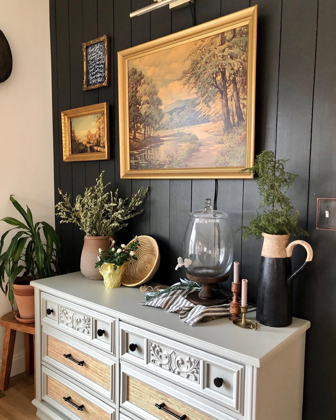 This matte grey shiplap wall sets the mood for a cozy, collected corner. Framed vintage art pops against the dark backdrop, while the ornate dresser softens the contrast with creamy tones and woven drawer fronts. Layered greenery and candlelight add texture without crowding the space. It’s cottagecore, but I made it curated.