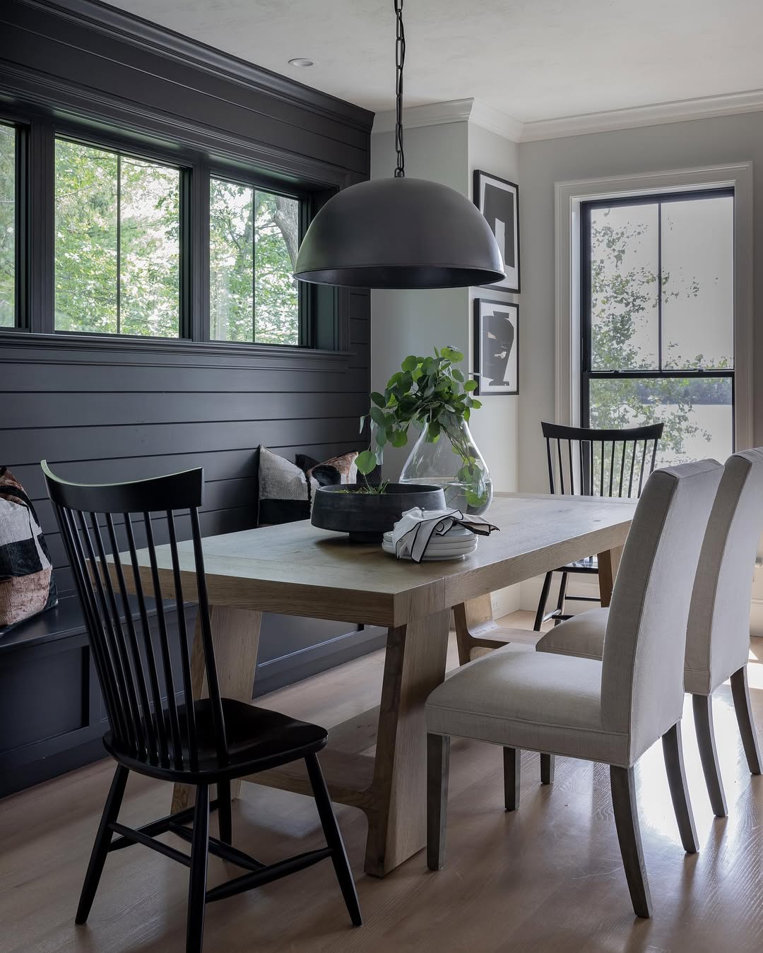 Shiplap goes dramatic in this dining nook, cloaked in a near-black tone that wraps the built-in bench and window wall. The oversized dome pendant plays into the mood, anchoring the soft-toned table below. Contrast comes courtesy of the mixed seating—black spindles on one side, upholstered comfort on the other. Who says farmhouse can’t flirt with modern noir?