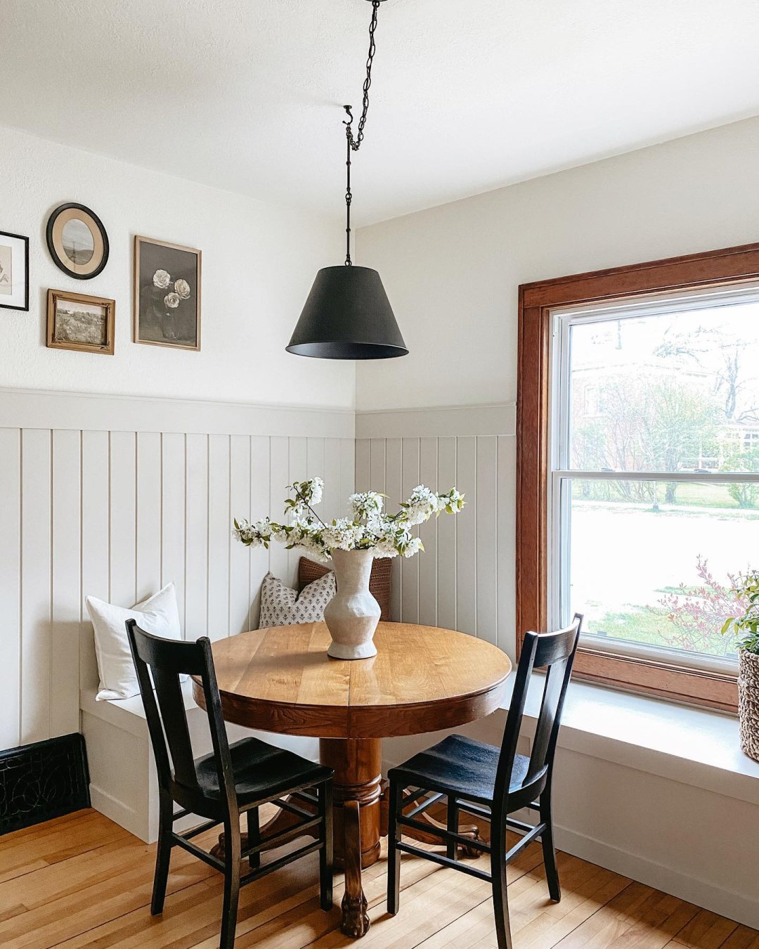 Vertical shiplap paneling gives this breakfast corner a tailored, old-school feel. The slim planks and soft neutral tone keep things light, even as the wood table adds warmth and history. A black pendant and spindle chairs ground the palette just enough. It’s the kind of spot that makes your morning coffee taste better.