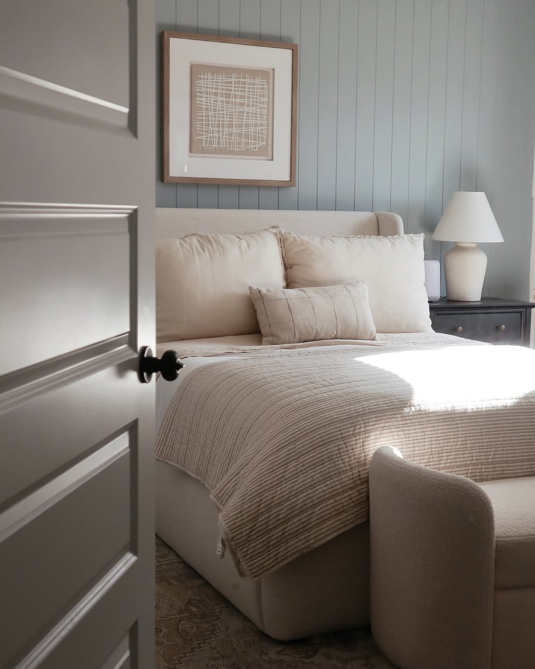 Vertical paneling in a muted blue-grey brings just enough color to this serene bedroom. The tone keeps the walls feeling fresh but not cold—perfect against those warm, creamy layers on the bed. Texture does the heavy lifting here, from the ribbed quilt to the boucle chair in the corner. Nothing shouts, everything soothes.