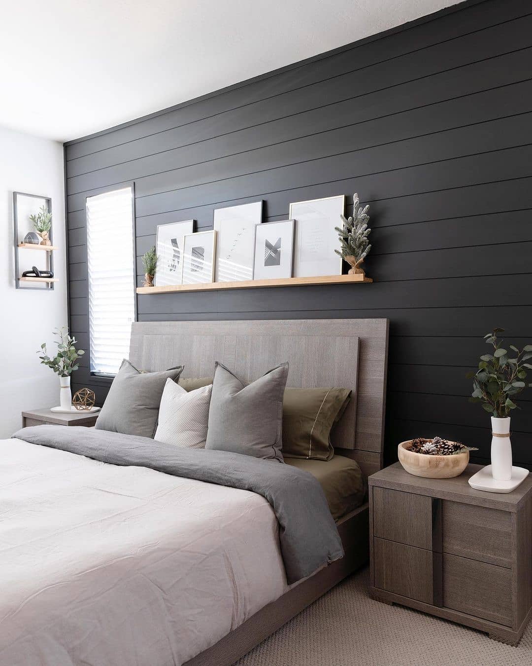 Grey shiplap gives this bedroom wall just the right amount of edge—sophisticated but not stuffy. The matte finish keeps things modern, while the horizontal lines add quiet movement behind the bed. Instead of art directly on the wall, a floating picture ledge softens the look and lets the frames casually lean. Bonus: no commitment gallery wall.