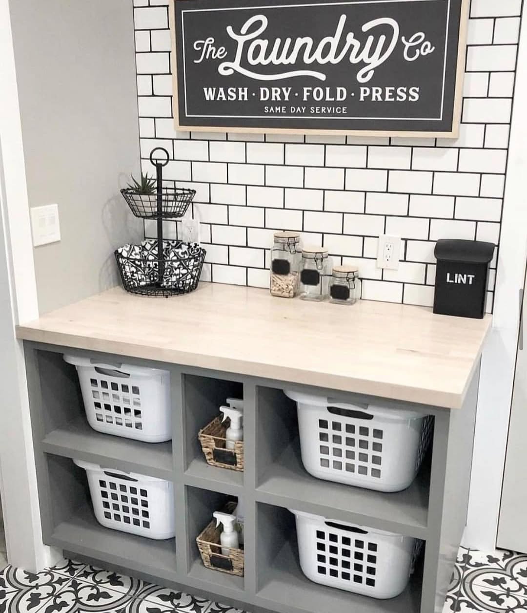 Grid-style cubbies hold classic white baskets and rattan bins for a clean, no-nonsense layout. The wood countertop softens the graphic tile and offers a spot to sort or fold. Wall art gives diner vibes, and yes—there’s even a dedicated lint bin. Practicality meets punchy charm.