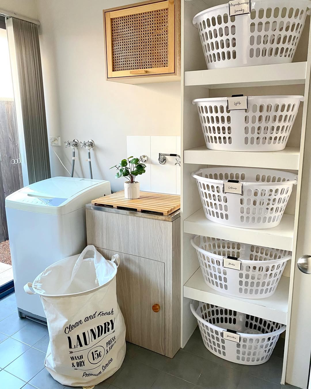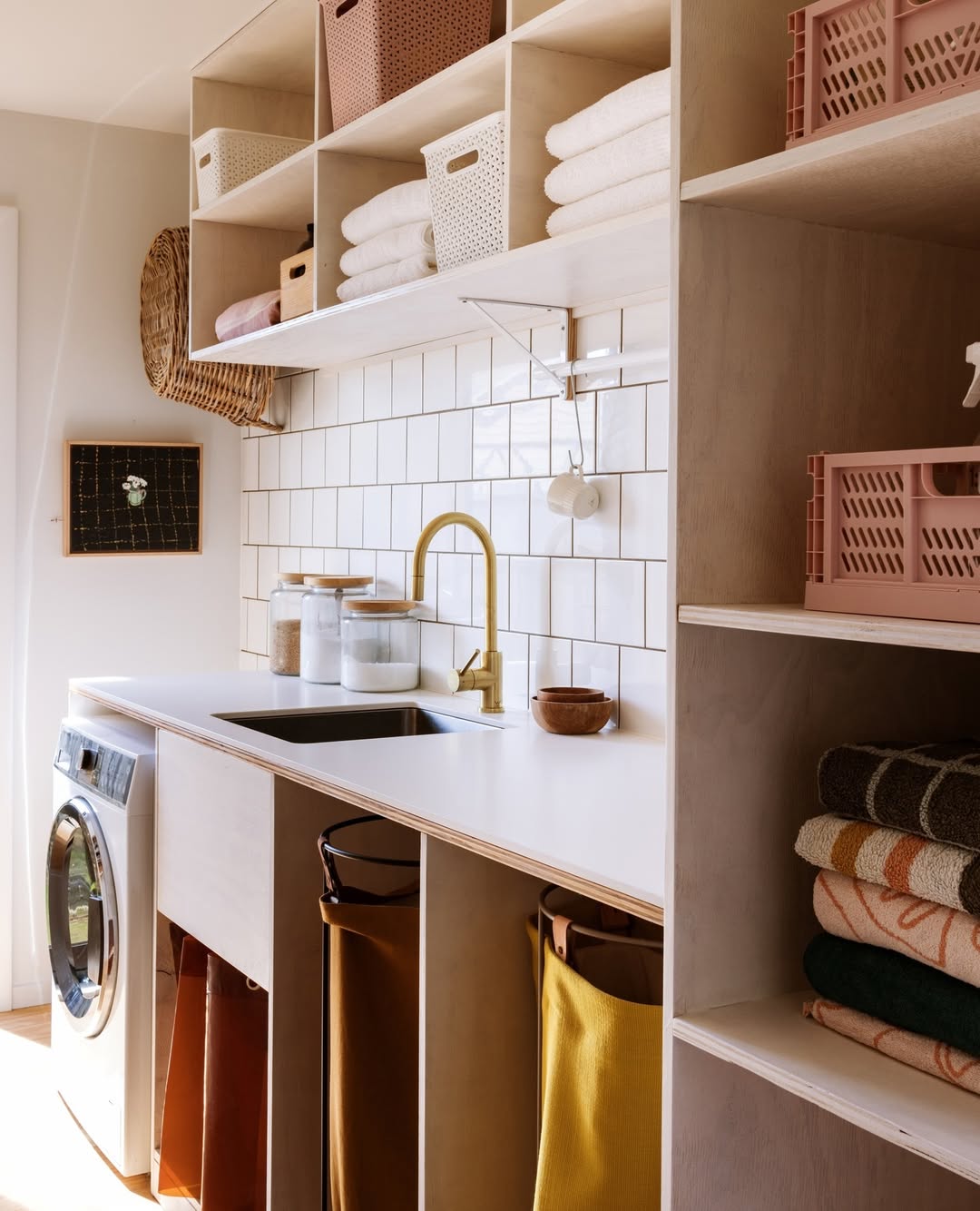 Each laundry basket gets its own shelf and label—so pre-sorting is built right into the system. The open cubby design makes it easy to grab, toss, or carry without disrupting the whole lineup. A rattan-front cabinet and slatted wood counter bring natural texture to an otherwise streamlined space. Simple, sunny, and smart.
