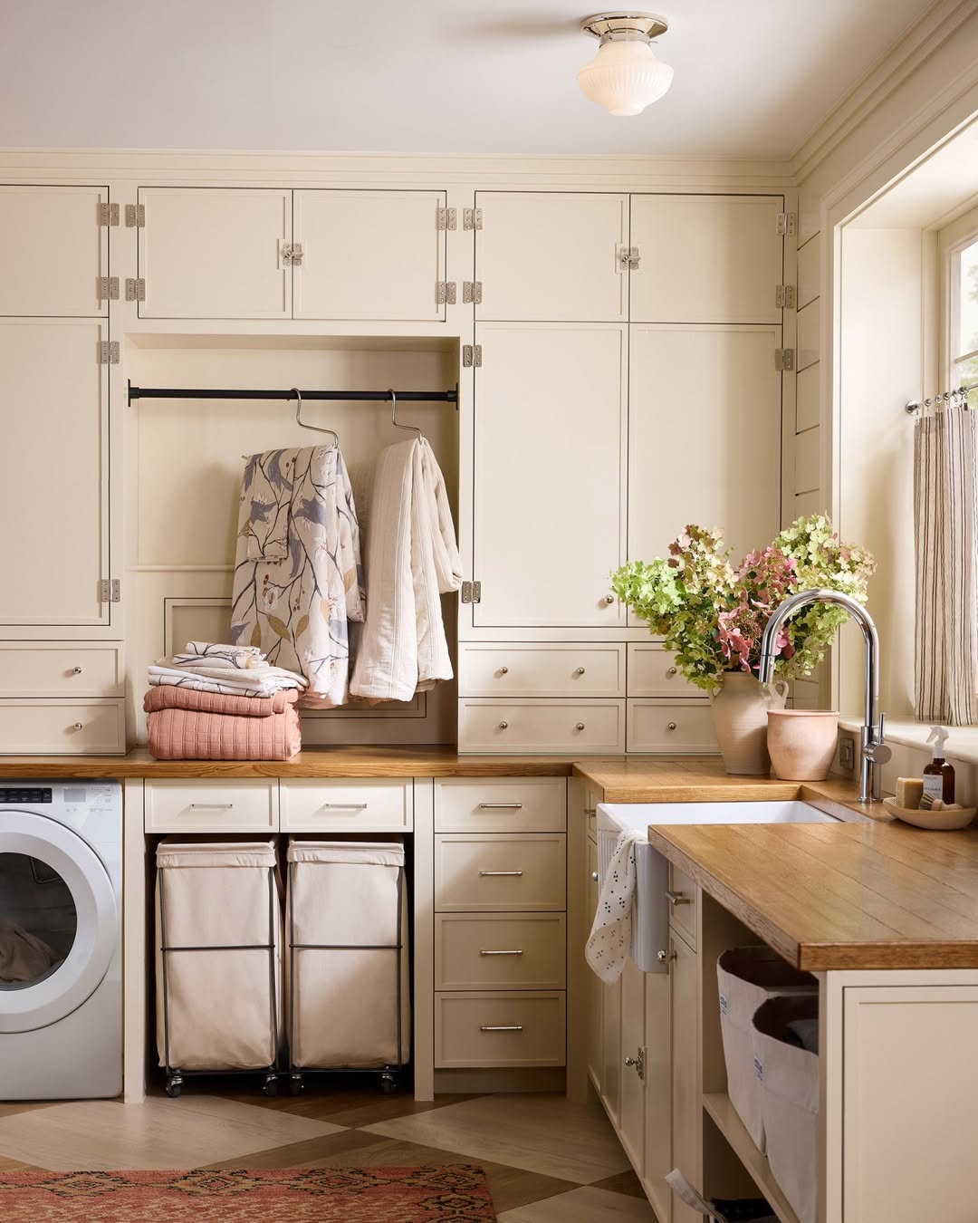 Dual rolling hampers tuck neatly under a butcher block counter—easy to pull out, easy to hide. Custom cabinetry wraps the space in creamy elegance, giving every detergent and clothespin its own drawer. A built-in drying rod and farmhouse sink turn routine into ritual. Proof that even chores deserve a beautiful backdrop.