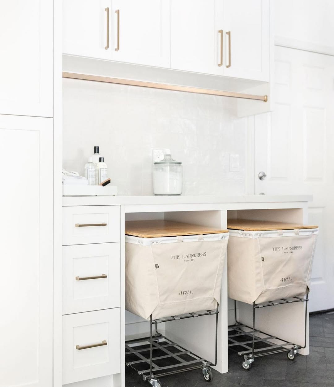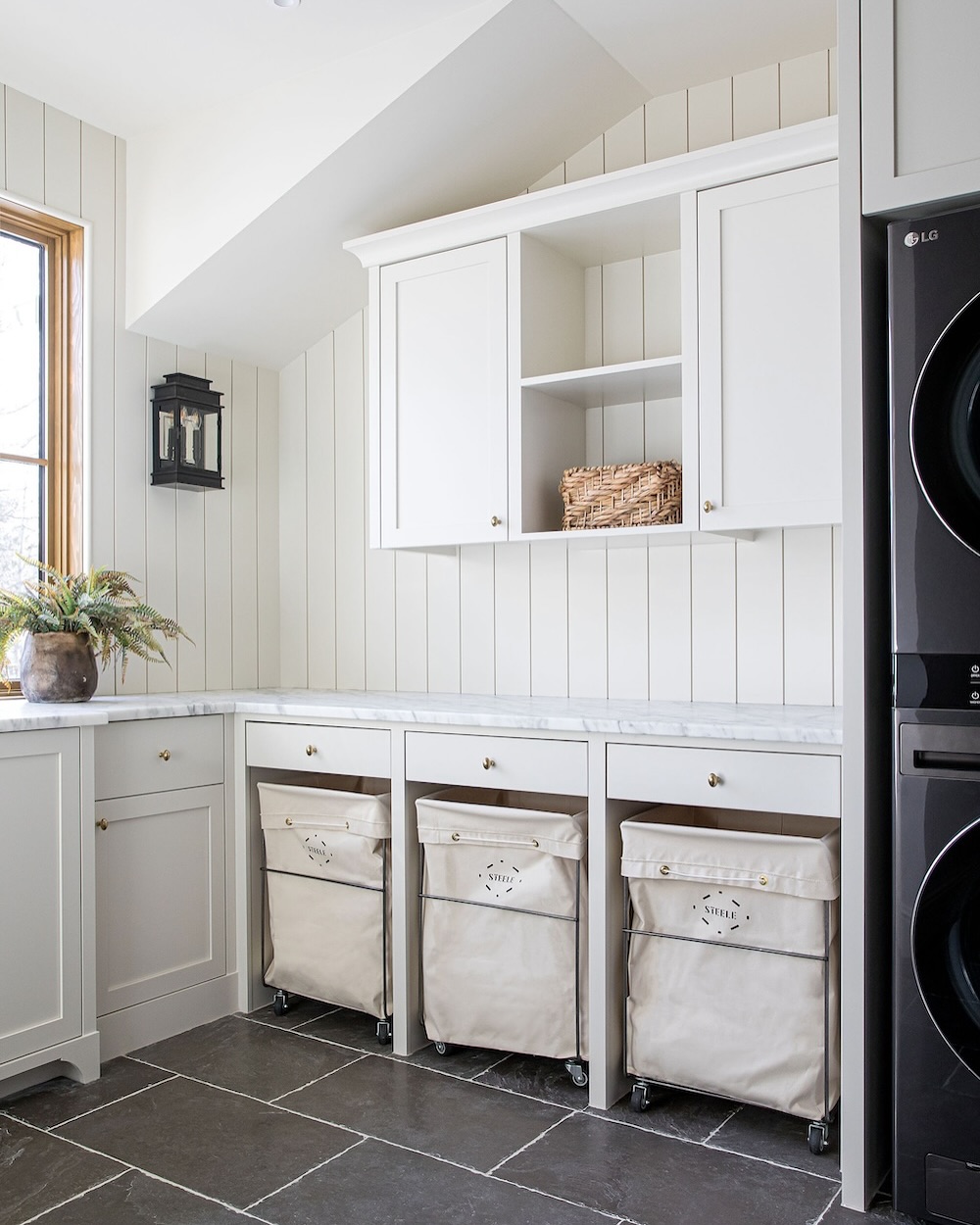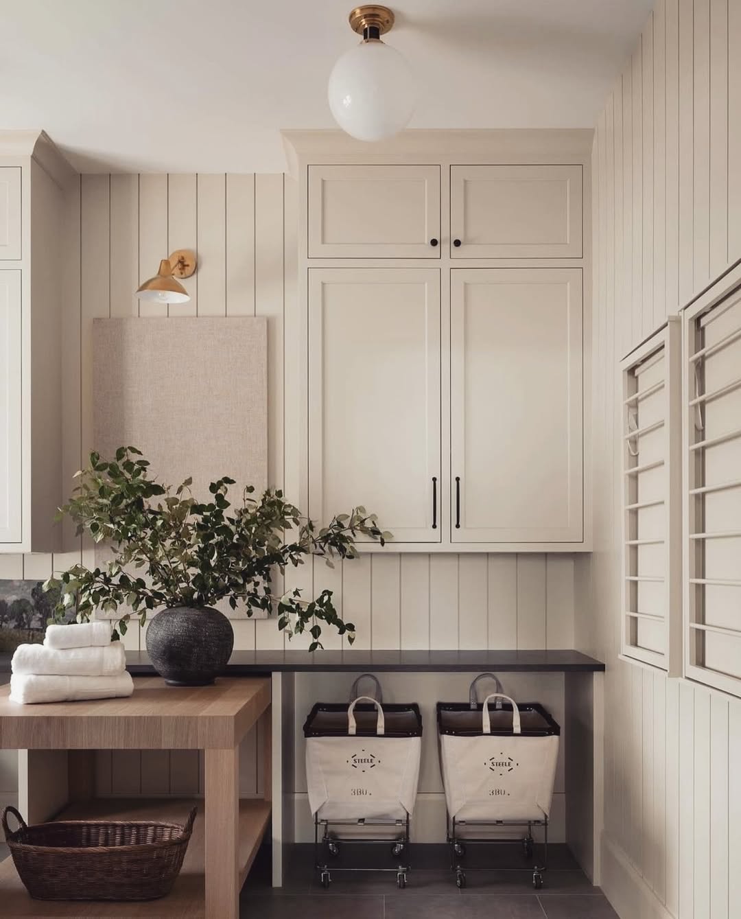 Neutral cabinetry and vertical paneling set a calm, timeless mood—but those twin rolling hampers keep the function front and center. Tucked under a dark stone counter, they’re easy to pull out and pretty enough to stay on display. Brass fixtures and a sculptural light fixture round out the quiet luxury feel. Laundry, but make it sultry.