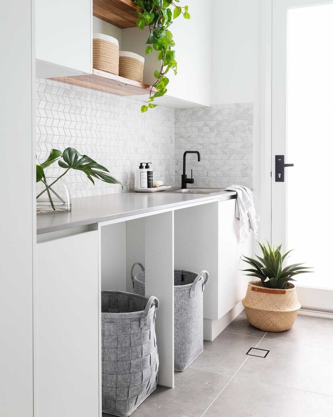 Woven felt bins slot right into this modern layout, proving soft-sided storage can still feel sharp. The full-height backsplash adds movement and texture without shouting, and the black faucet grounds the space. Wood accents and leafy greens keep it from feeling too cold. Clean lines meet cozy corners.