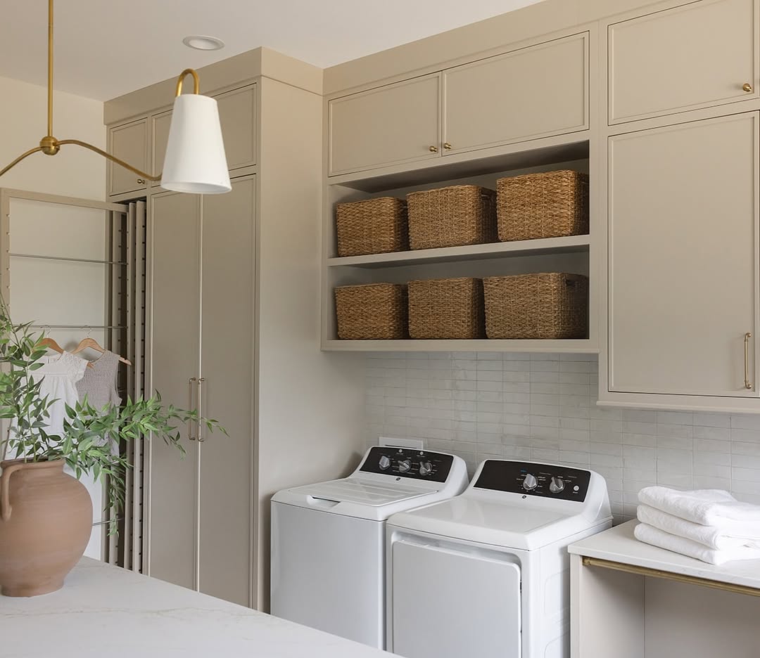 Open shelving above the washer and dryer turns into prime storage real estate thanks to matching woven bins. The neutral cabinetry and slim brass hardware keep the look elevated, not utilitarian. A soft tile backsplash adds just enough texture to break up the monochrome. It’s crisp, quiet, and completely collected.
