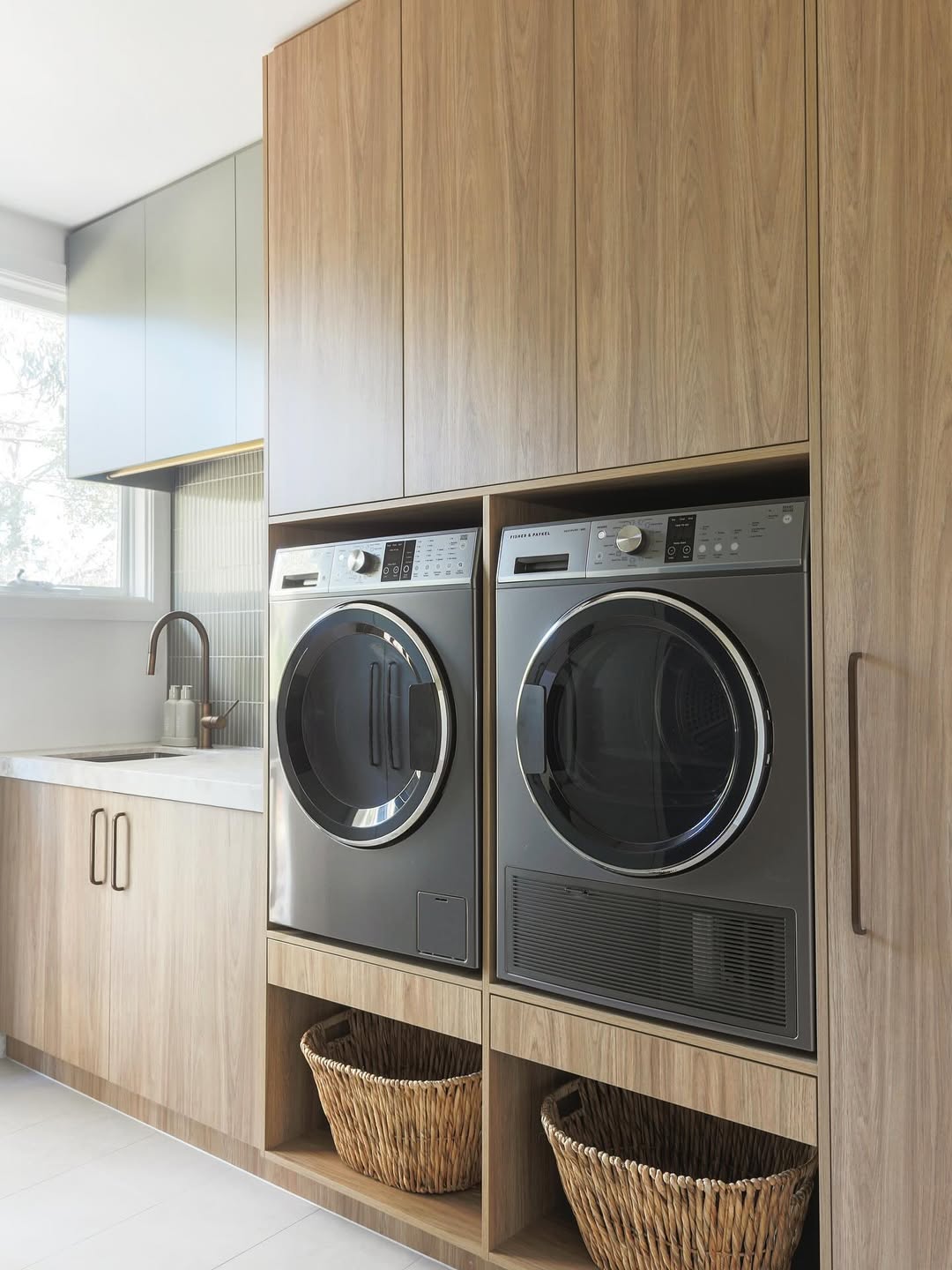 Full-height wood cabinetry wraps the washer and dryer like sleek, modern furniture. Open cubbies below keep wicker hampers close but discreet, softening the streamlined look. Matte black hardware and warm tones create a spa-level calm. Function hides in plain sight—and looks good doing it.