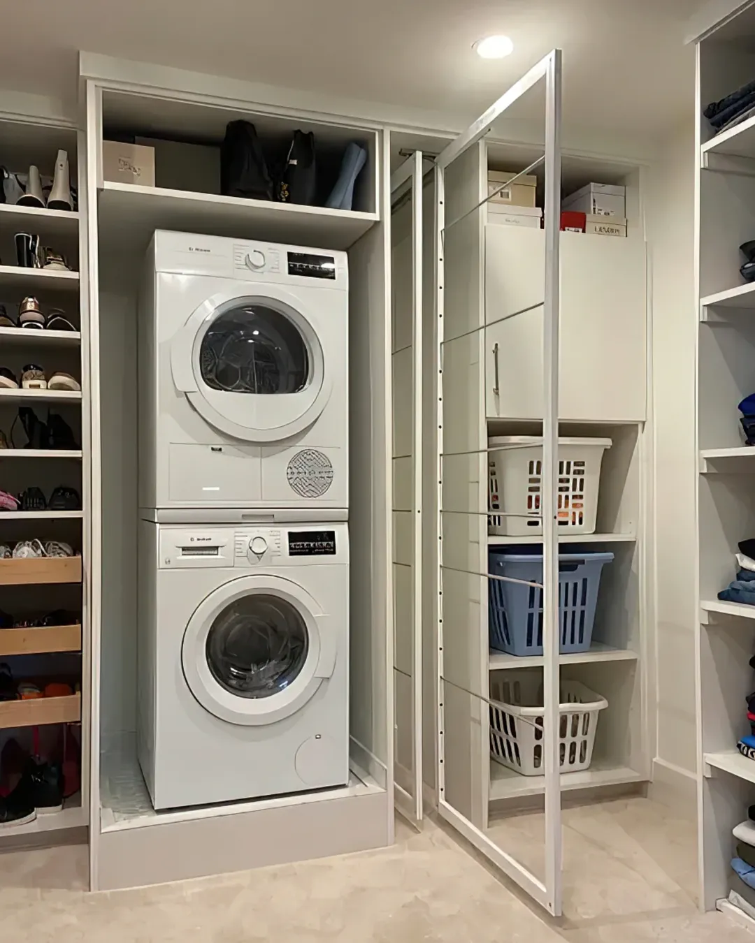 This compact laundry setup sneaks right into a walk-in wardrobe—but the real star is the pull-out rack concealing a full set of laundry baskets. No doors, no bulk—just smart vertical space planning. The stacked machines keep the footprint small while every inch around them works overtime. Discreet, sleek, and totally efficient.