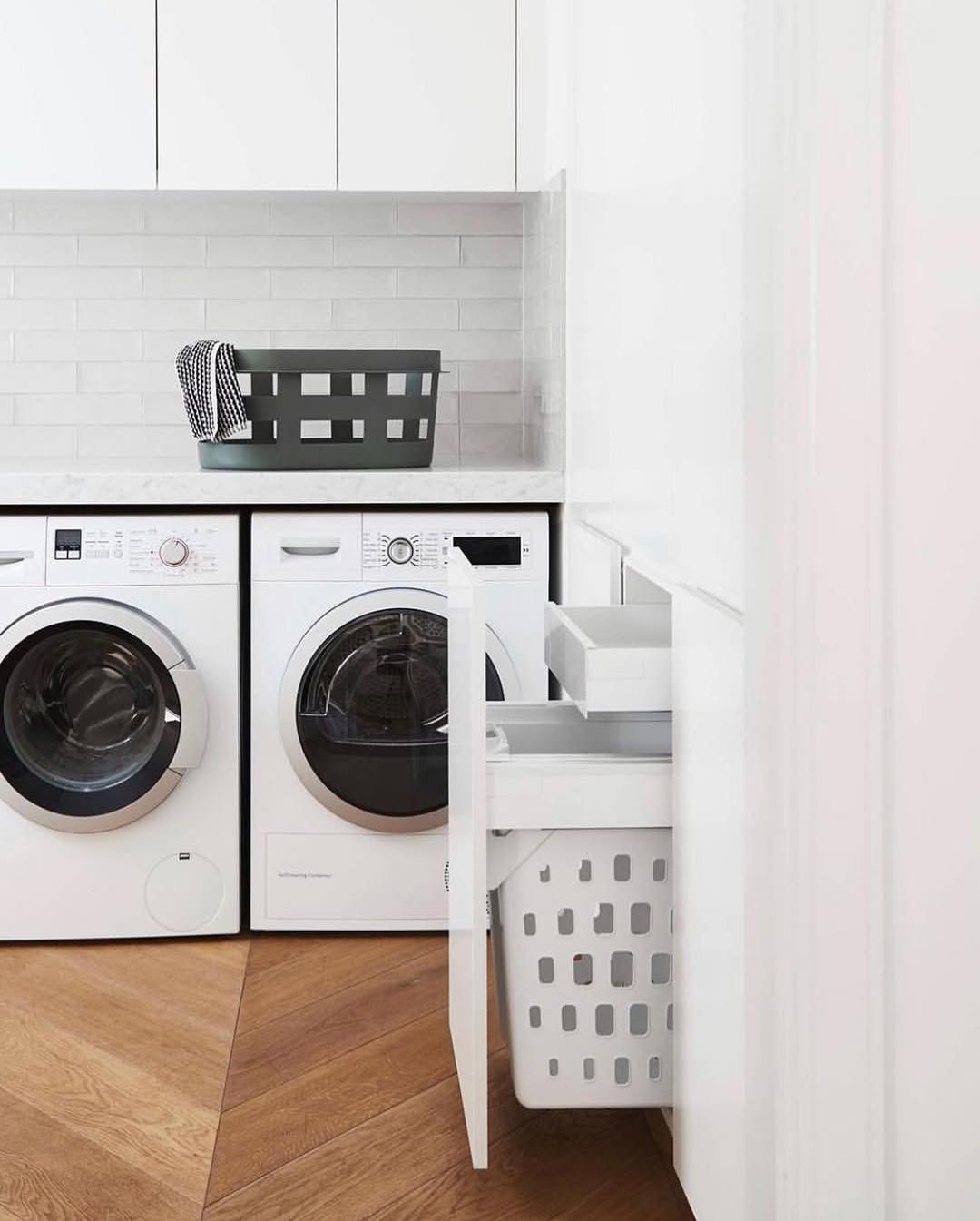 A sleek cabinet hides a full-size laundry basket, blending form and function without skipping a beat. The front-load machines sit flush under a marble counter, making room for folding or styling up top. White cabinetry and pale subway tile keep things calm, while the chevron wood floor brings the heat. Clean lines meet clean clothes.