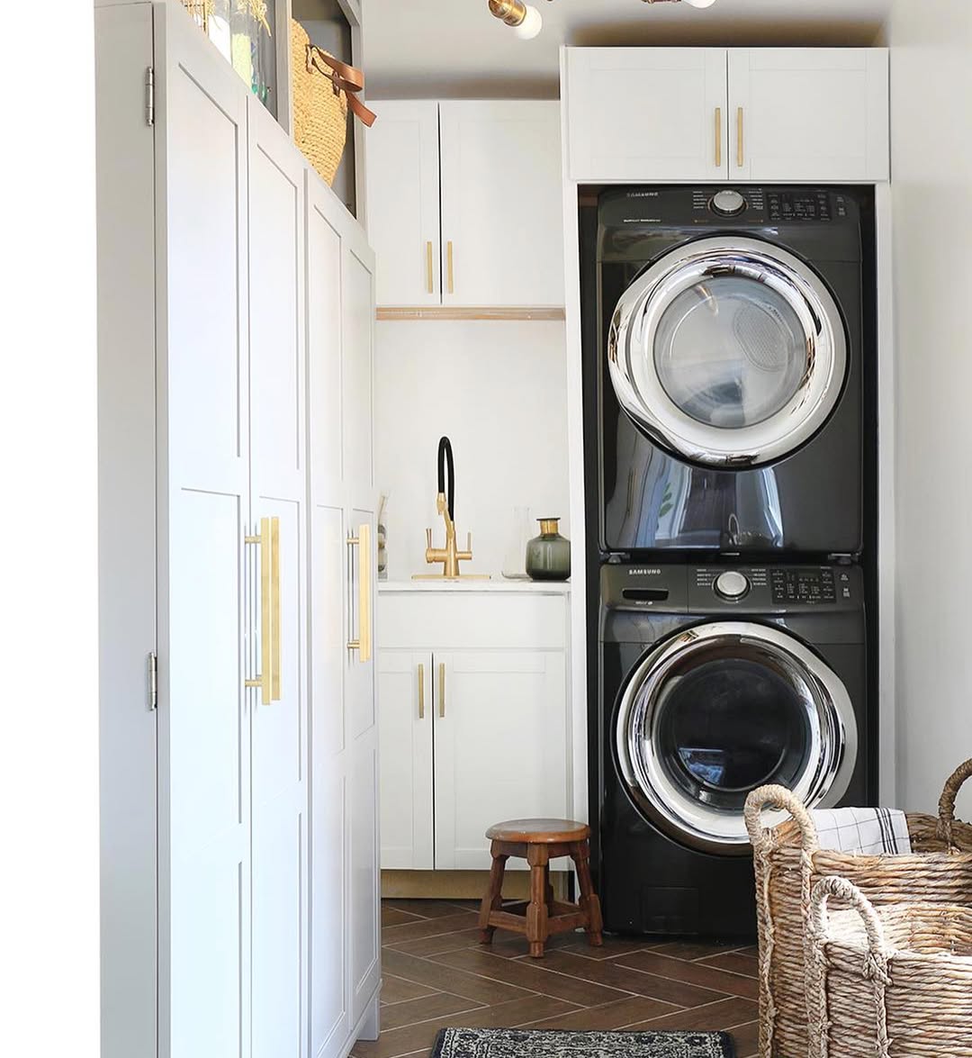 The stacked washer-dryer in bold black steals the spotlight—sleek, powerful, and space-saving. Gold hardware and a sculptural faucet elevate the white cabinetry, giving this laundry room a boutique-hotel feel. A woven basket keeps things casual, while the tiny wood stool adds a charming, lived-in touch. Compact never looked so glam.
