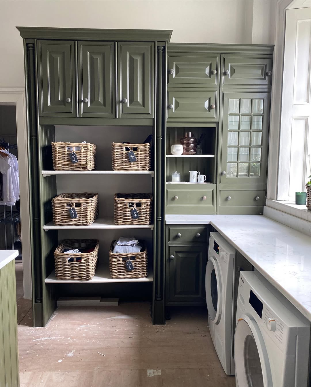 Open shelving with labeled baskets keeps laundry sorted without spoiling the mood of this richly painted space. The deep green cabinetry adds a vintage, almost library-like charm—unexpected but totally working. Tall cupboards, glass doors, and crown molding make it feel more like a butler’s pantry than a laundry zone. Functional, but make it regal.