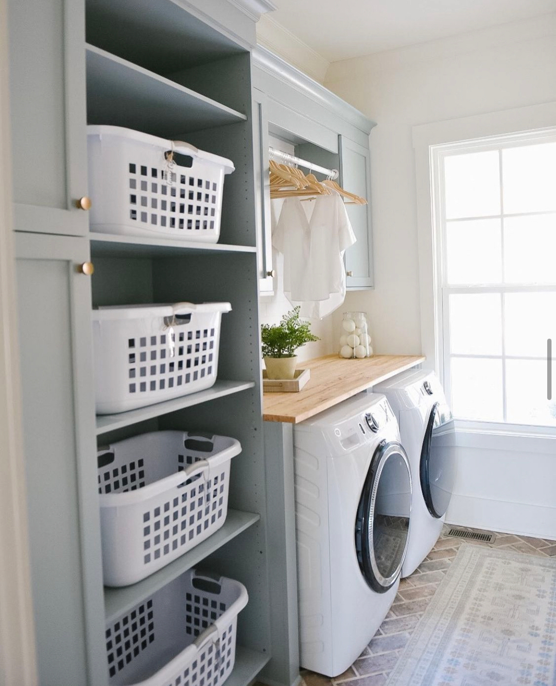 Cubbies painted in soft blue-gray turn basic plastic laundry baskets into part of the design. Each bin gets its own shelf, making sorting intuitive and keeping floors clear. The butcher block counter adds warmth, while a hanging rod and sunlit window keep the whole space feeling fresh and airy. It’s calm, coastal, and completely practical.