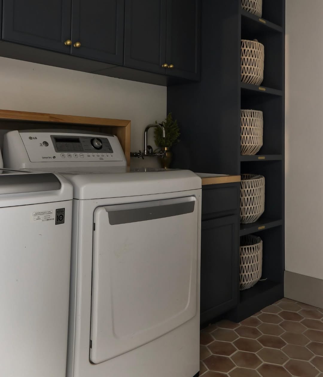 Tall open shelving in deep navy adds drama, while cream-toned baskets lighten the look and keep laundry sorted by shelf. Brass hardware ties it all together, giving just the right amount of shine. A small sink and wood trim details make the space feel thoughtful and tailored. It’s moody, modern, and made for multitasking.