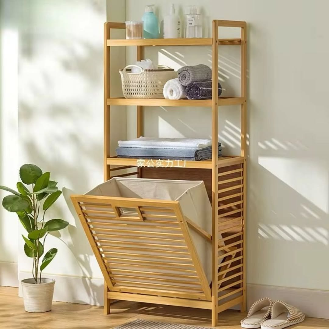 This bamboo unit blends towel storage and laundry duty without looking like it’s trying. The tilt-out basket hides laundry behind slatted wood, so the mess stays out of sight (and mind). Upper shelves carry the calm—with rolled towels, soft baskets, and spa-day essentials. It’s giving “clean home, clear mind.”