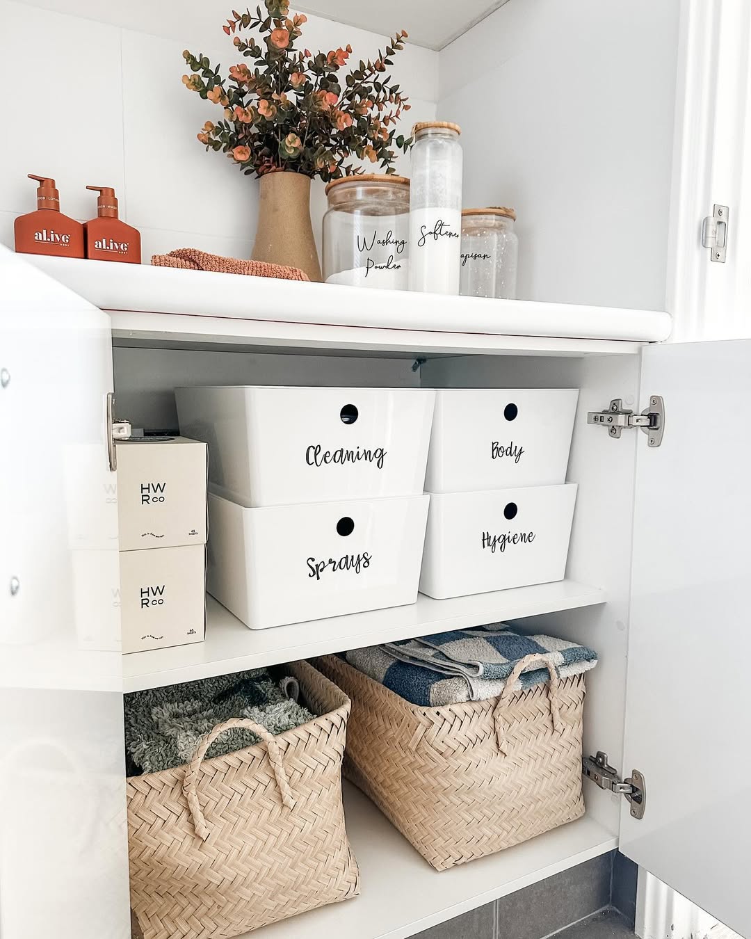 Labeled bins take the guesswork out of storage—and somehow make cleaning supplies look cute. White stackables keep categories clear (Cleaning, Body, Hygiene), while woven baskets below add texture and warmth. Glass jars up top turn powders and pods into pretty shelf decor. A cabinet that’s both practical and Pinterest-worthy.