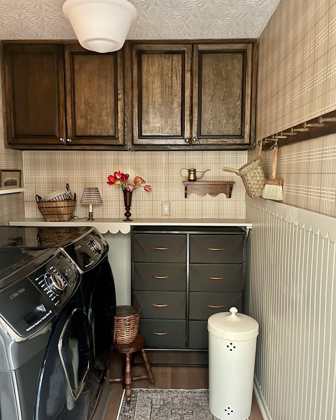 Plaid wallpaper, scalloped trim, and wicker accents bring pure vintage charm—but it’s the soft-sided drawer tower that sneaks in smart storage. Fabric bins make sorting a breeze without clashing with the room’s cozy, curated vibe. Wall pegs keep cleaning tools within reach but off the floor. Proof that function and frill can totally coexist.