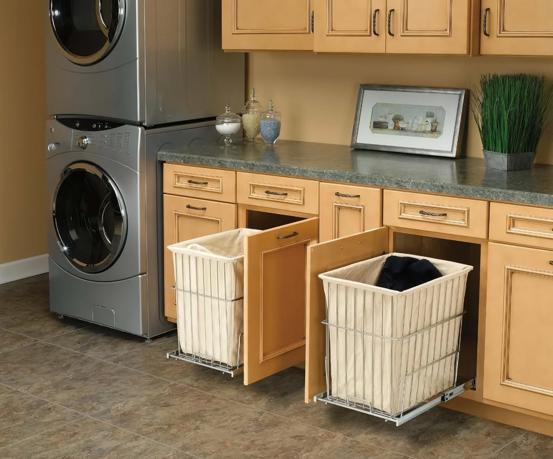 Built-in laundry bins slide out like drawers, keeping the chaos contained behind closed doors. Dual hampers make sorting simple—lights and darks, no thinking required. The wire frames hold sturdy fabric liners that lift right out on laundry day. Sleek, seamless, and surprisingly satisfying to use.
