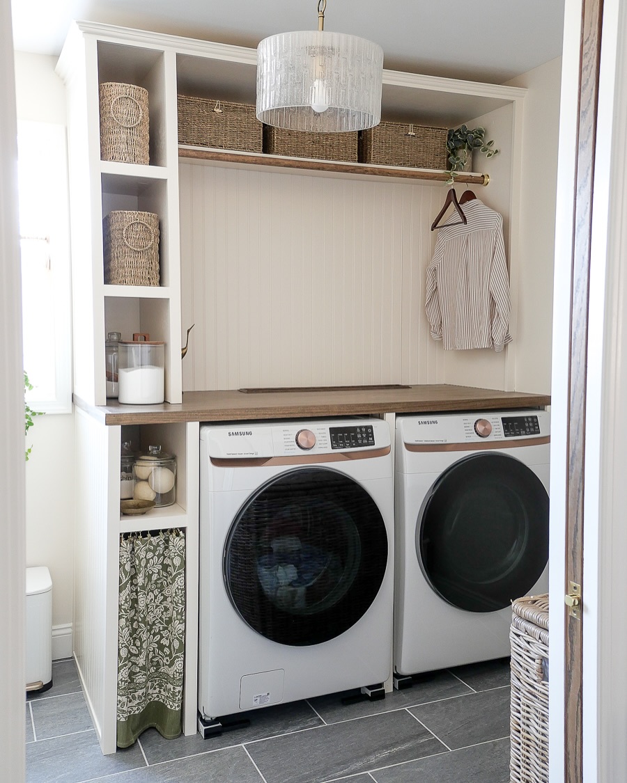 A wood countertop bridges the washer and dryer, giving a smooth surface for folding and styling. Above, a brass rod stretches the full width—perfect for drip-drying or outfit prep. Woven baskets up top hide the chaos while soft fabric panels below keep supplies tucked out of view. Finished off with a glam light fixture, it’s equal parts utility and polish.