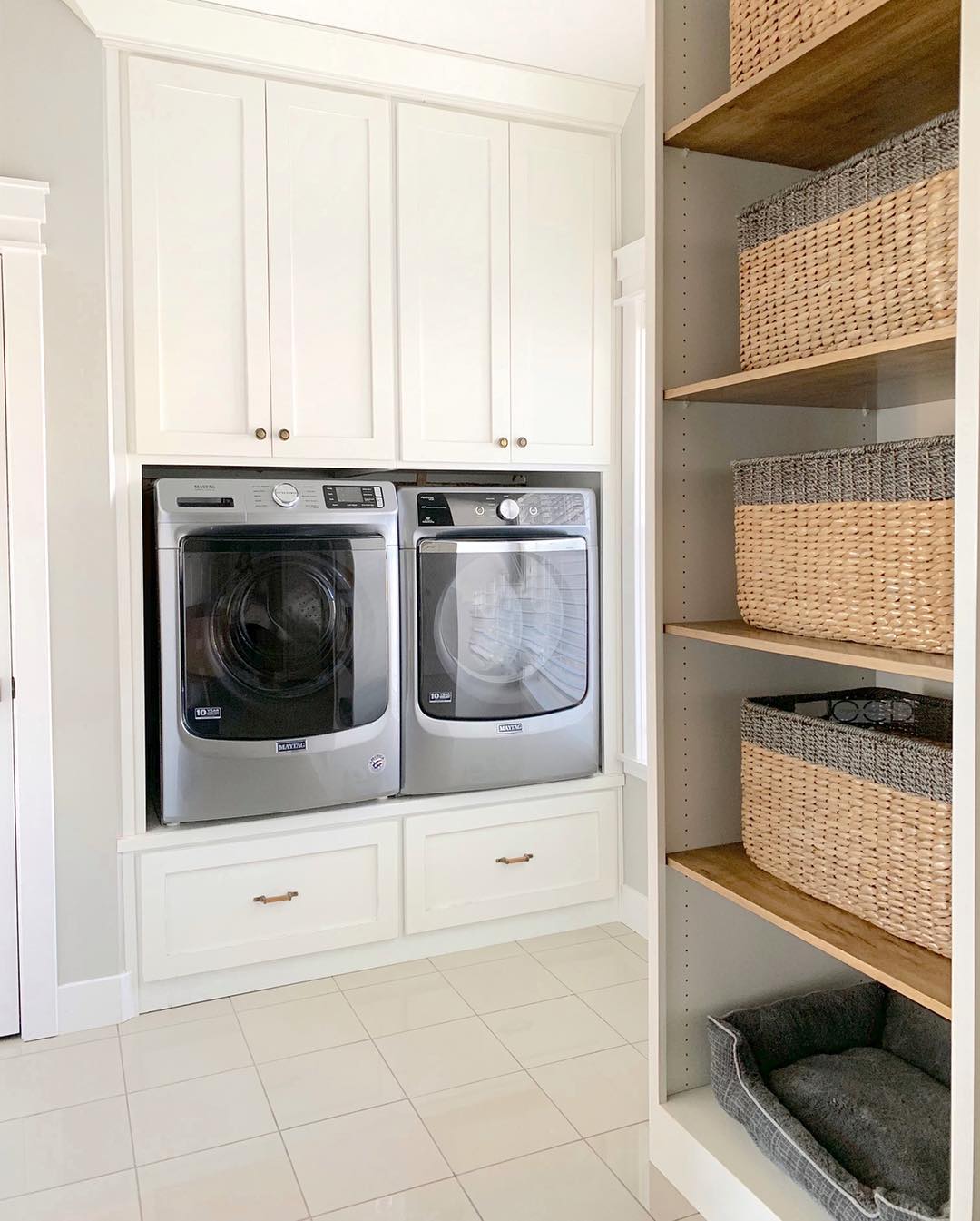Built-in cabinetry keeps this laundry zone feeling crisp and intentional. The washer and dryer sit snugly in their nook, with deep drawers below for storing bulky items like dryer sheets or cleaning rags. Off to the side, open shelves stacked with baskets make sorting easy and visually clean. No visual clutter, no wasted space.