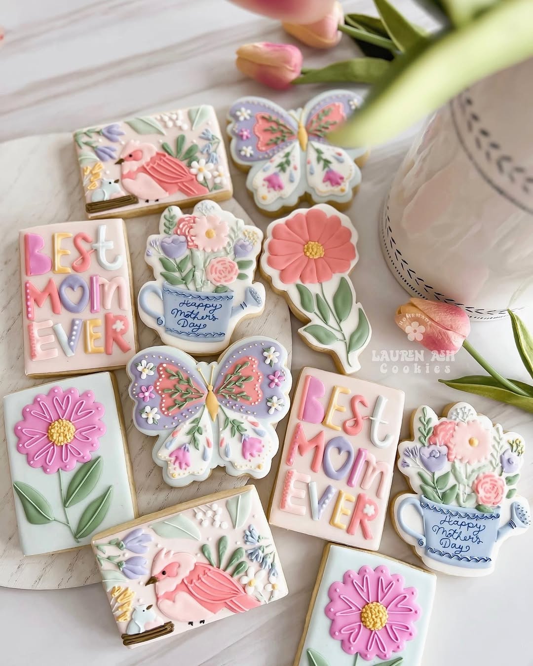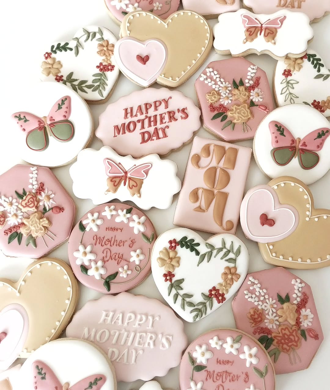 Bright, cheery, and unapologetically extra—this set turns cookies into mini masterpieces. Sculpted butterflies, bold florals, and layered teacup bouquets deliver serious texture, while the “Best Mom Ever” block lettering feels fun and fresh. Icing is piped with painterly precision, mixing pastels with pops of coral and mustard. A perfect choice for bakers who love color and customers who want to wow.