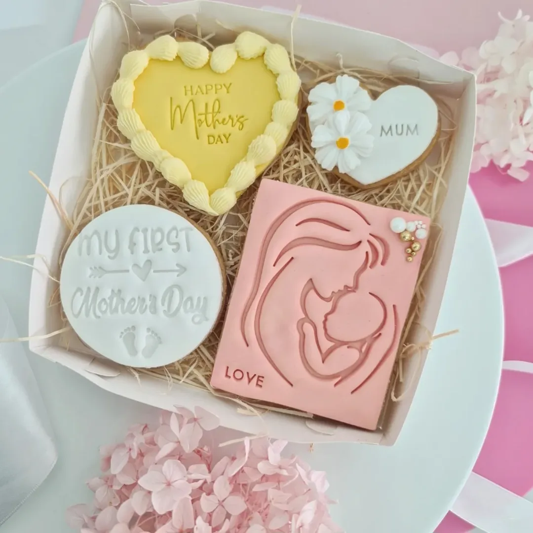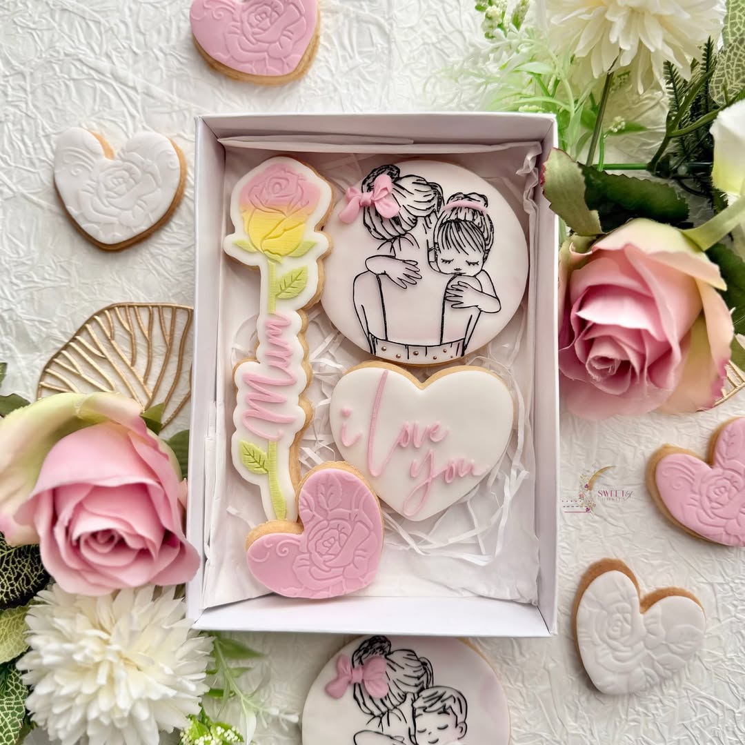 Soft pastels and delicate line art give this set an emotional pull that’s hard to miss. The mother-daughter sketch, hand-piped in black against white fondant, feels like a page from a love letter. Paired with rose-accented hearts and a stem-shaped “Mum” cookie, it’s equal parts sweet treat and sentimental keepsake. Perfect for bakers leaning into storytelling through sugar.