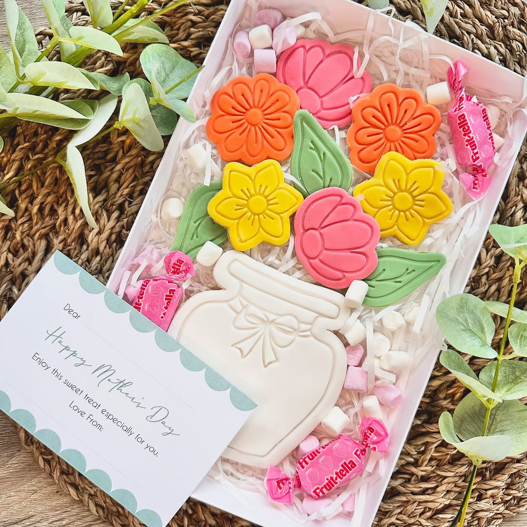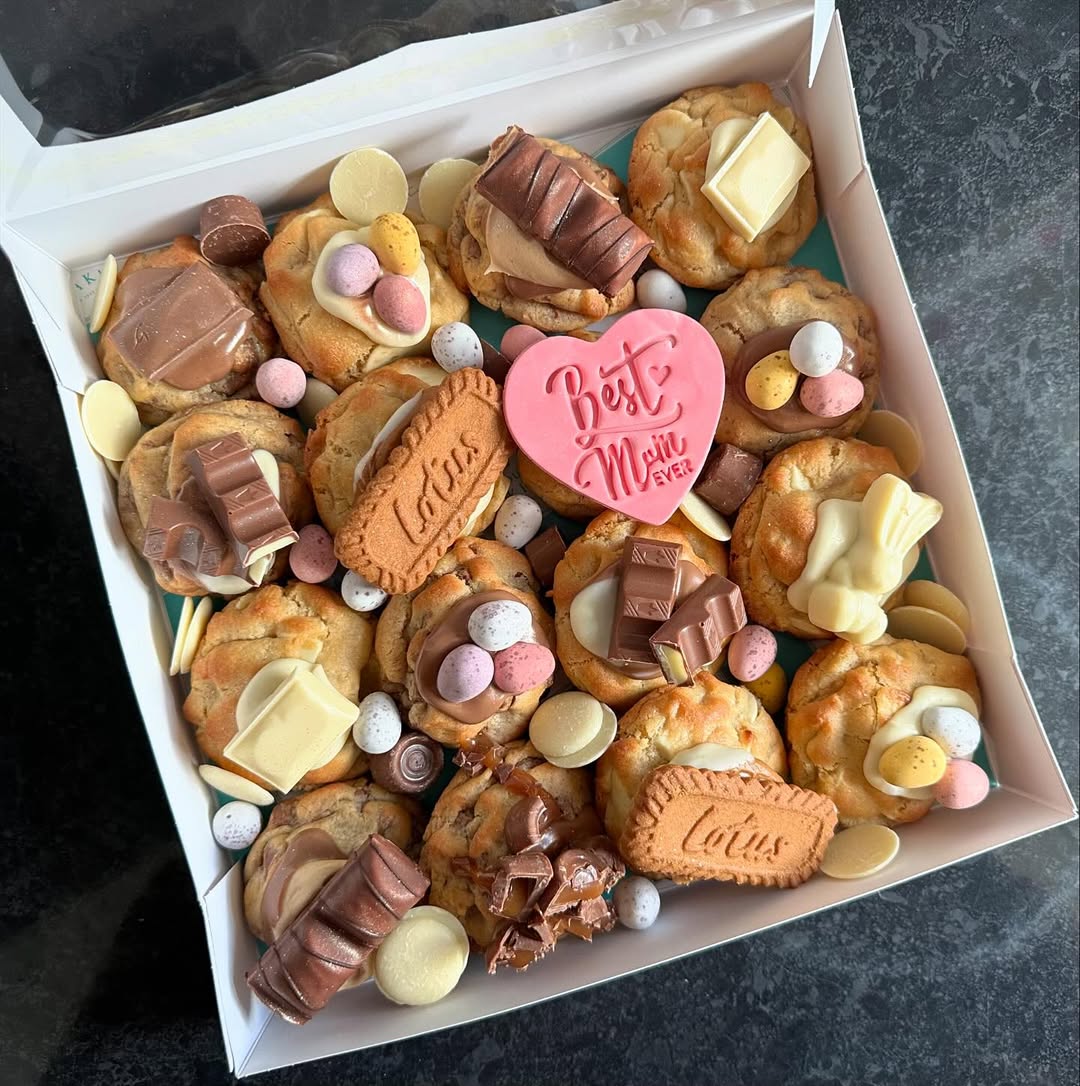Loaded with mini eggs, candy bars, and cookie chunks, this box is a snack-lover’s dream disguised as a Mother’s Day gift. The center heart cookie adds a sweet “Best Mum Ever” message, but let’s be honest—it’s the stuffed dough and melty chocolate that steal the show. Ideal for sellers leaning into indulgence over dainty, because not all mums want macarons.