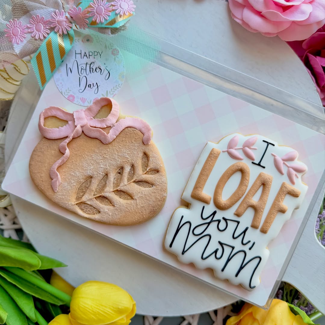Rustic textures meet playful wordplay in this adorable duo. One cookie channels farmhouse vibes with its embossed leaf and fondant bow, while the other delivers a cheeky “I Loaf You, Mom” pun in bold, layered lettering. Soft pastels and clean packaging give it major gift-shop appeal. Ideal for sellers who want to bring a smile—and a snack—to Mother’s Day.