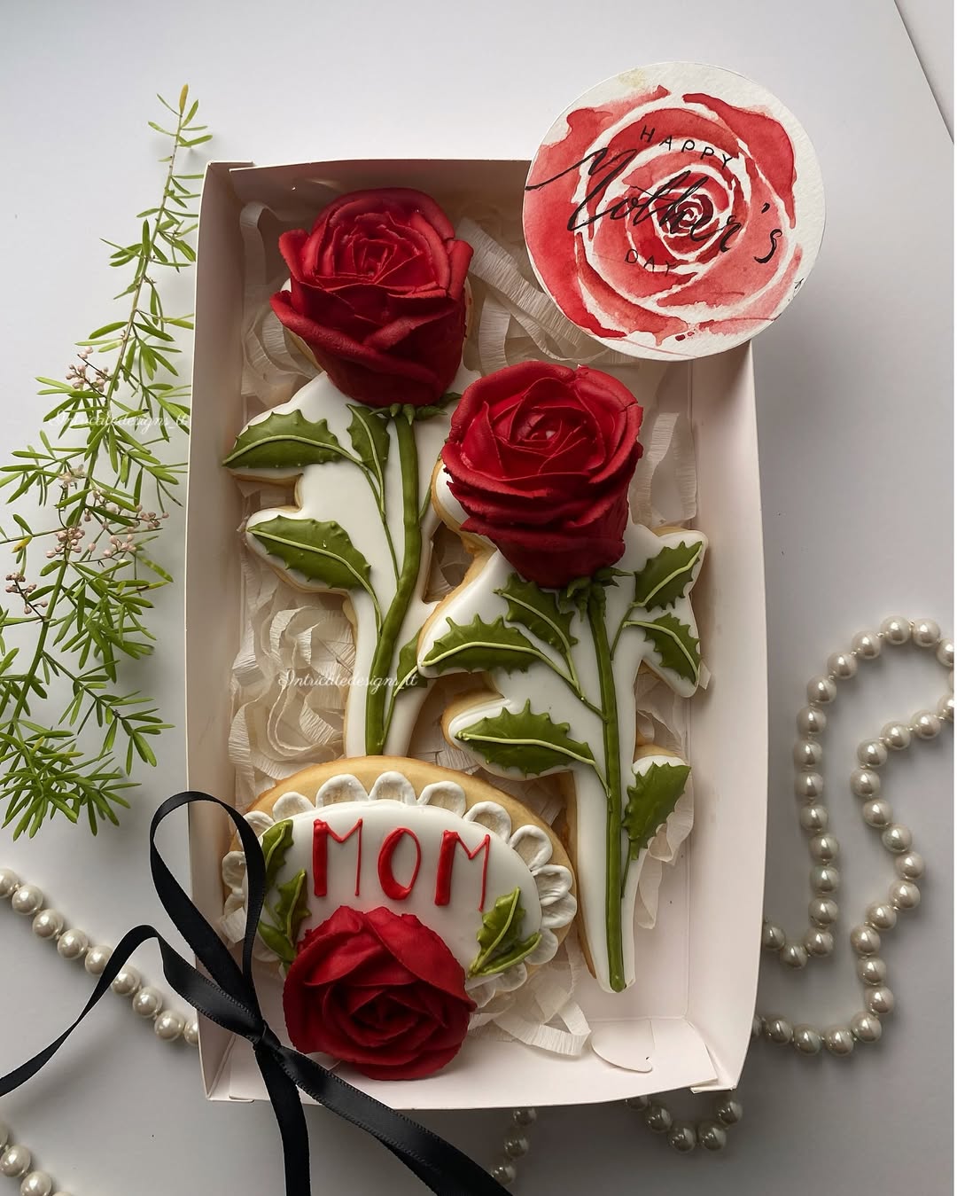 Realistic red roses meet intricately iced stems in this striking cookie set that leans into romance and drama. Crisp white bases and piped green leaves create the perfect canvas for those bold, velvety blooms. A single scalloped cookie stamped with “MOM” ties it all together—elegant, minimal, and just a little bit vintage. Ideal for upscale gifting when flowers alone don’t cut it.